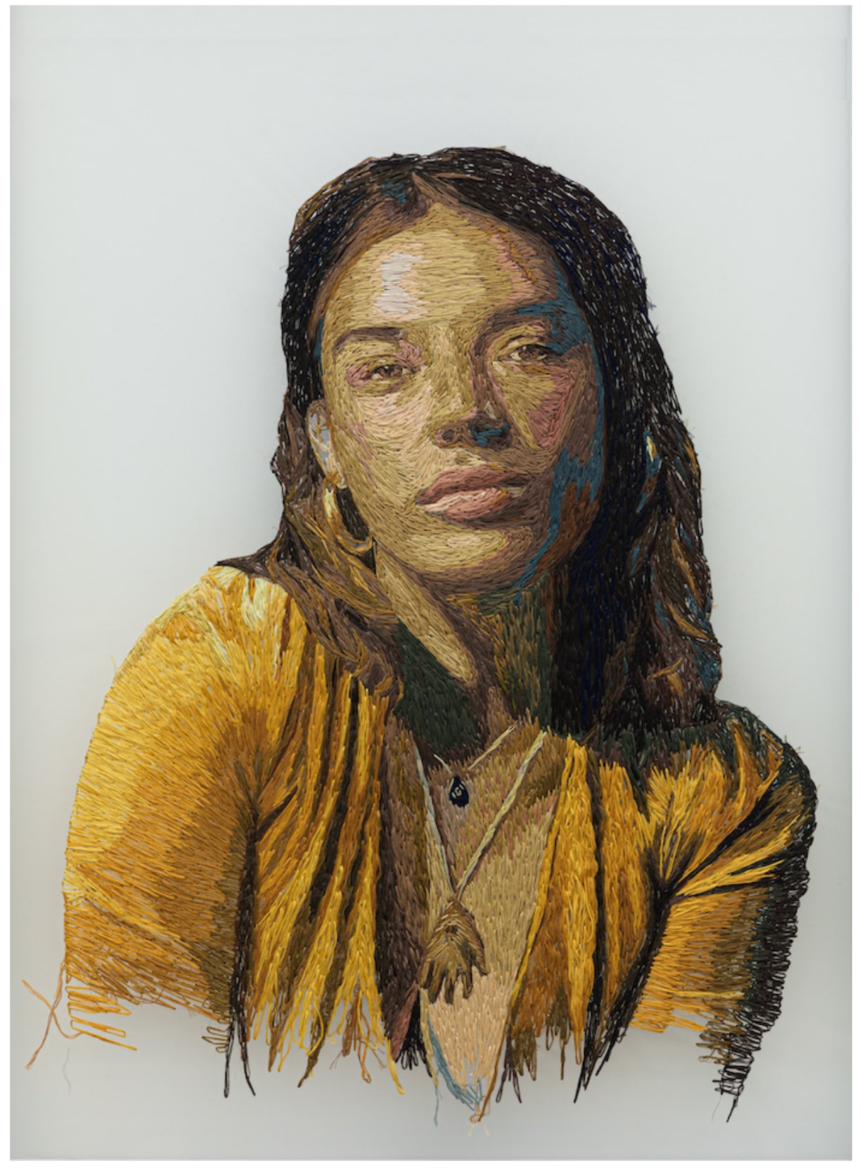 This piece was commissioned by the Frist Art Museum. For this community-based project, I was asked to interview a first-time voter in the 2020 election. My good friend Drenusha Kolshi, here in the portrait, had just become naturalized in order to gain her voting rights. I wanted to make her portrait larger than life to capture her story and to show the viewers how the fabric of our society is made of many different and beautiful stories.