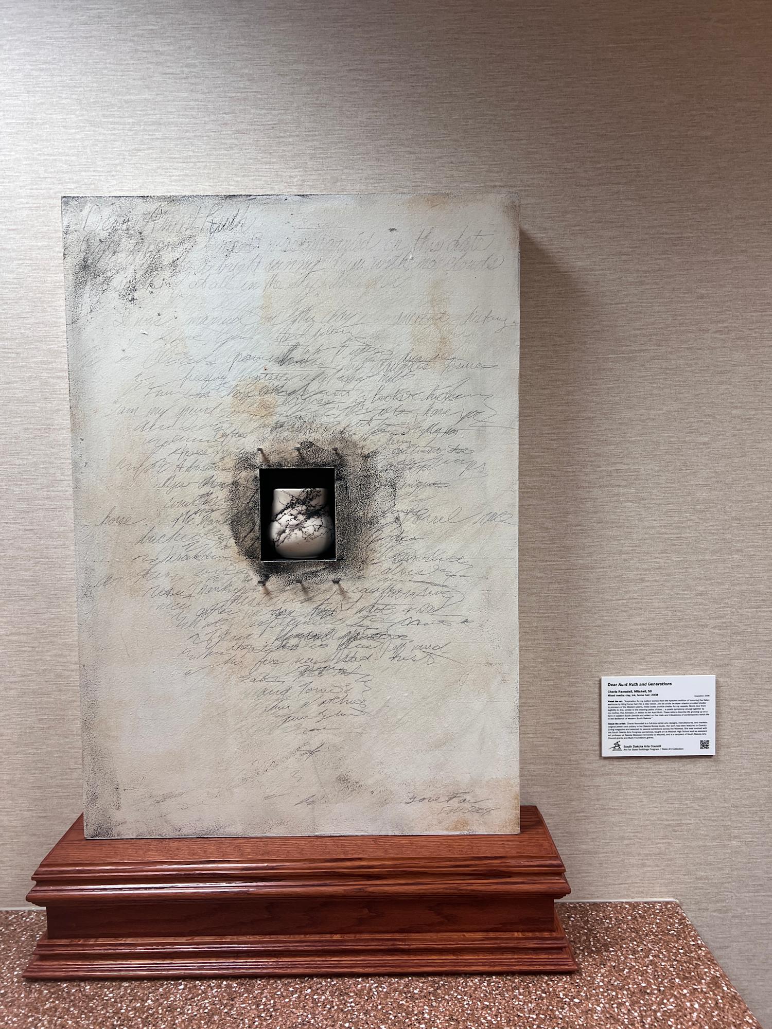 warhorse by firing horse hair into a clay vessel. Just as crude tarpaper shacks provided shelter to pioneers of the Western plains, these boxes provide shelter for my vessels. Words blur from legibility to line, similar to the weaving paths of time ... a poetic symphony strung together by my mother, Fae Johnston, in letters to her Aunt Ruth. These letters describe life growing up on a