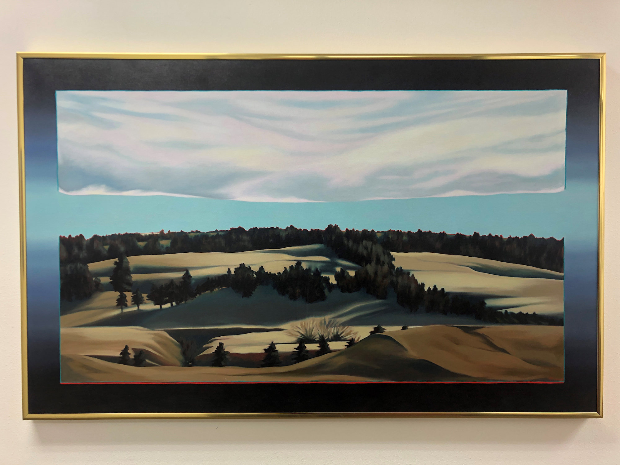 “My intent by floating the planes of both sky and earth within a surround of graded blues is to create a contrast between a specific patch of earth and sky and the timeless infinity of space in which we float. I keep a set of severe limits to create some tension in finding ways to relate the earth and sky or what happens between them. Among these limits is the effort to strip away detail, paring down to the essential landforms and smoothing the flourishes of the brush to express the elemental silence the huge space of the plains evokes in me. The horizon is marked by a red line, but sometimes that line must occur elsewhere in the painting. I think of the red line as the life force.”