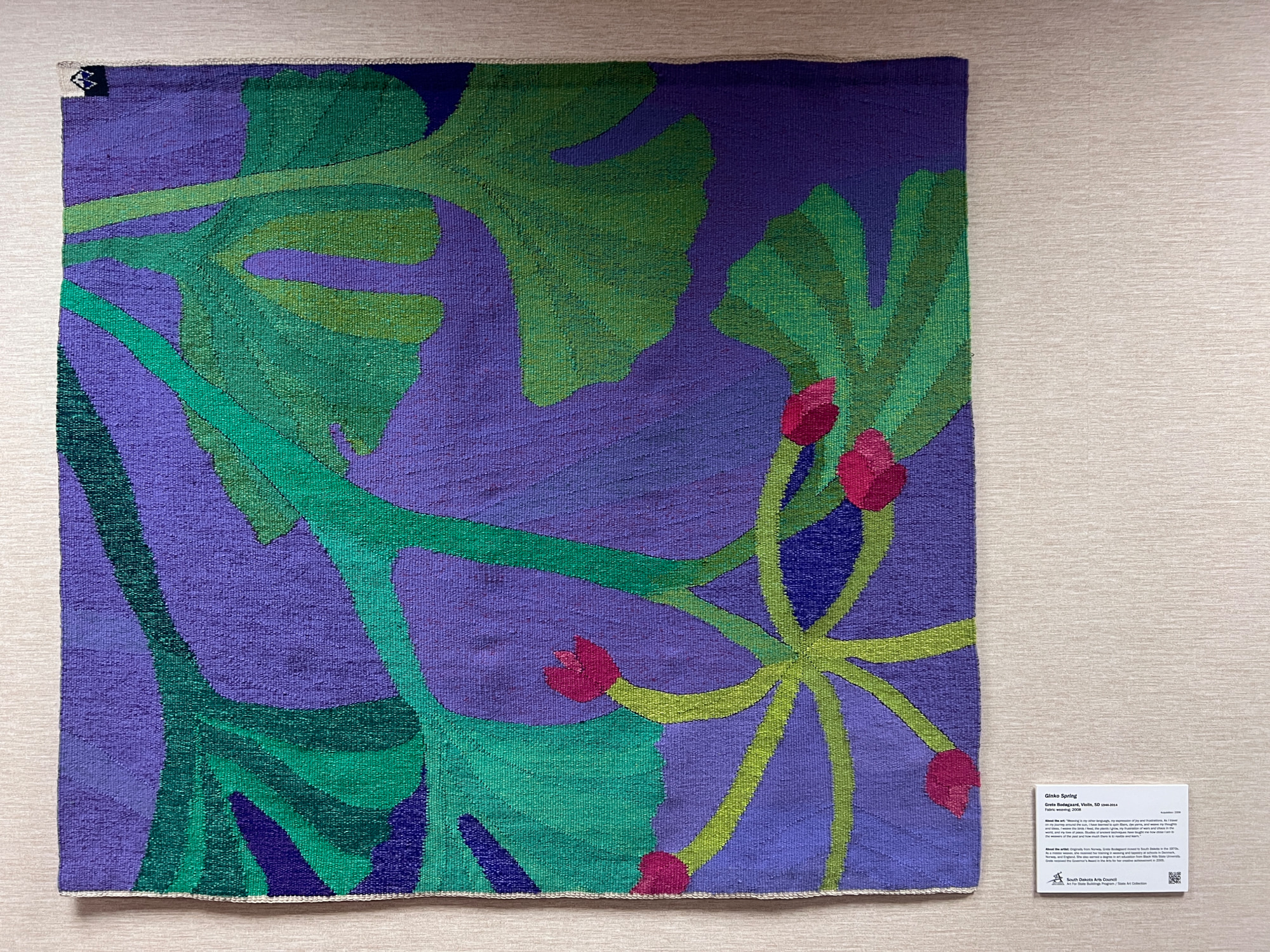 Originally from Norway, Grete Bodøgaard moved to South Dakota in the 1970s. As a master weaver, she received her training in weaving and tapestry at schools in Denmark, Norway, and England. She also earned a degree in art education from Black Hills State University. Grete received the Governor’s Award in the Arts for her creative achievement in 2005.