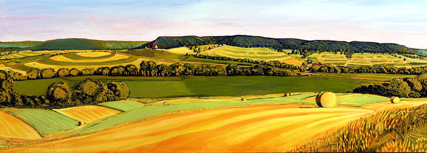 - Subject Matter: Landscape from high point looking across rolling prairie pastures and trees, fields of crops and round hay bales