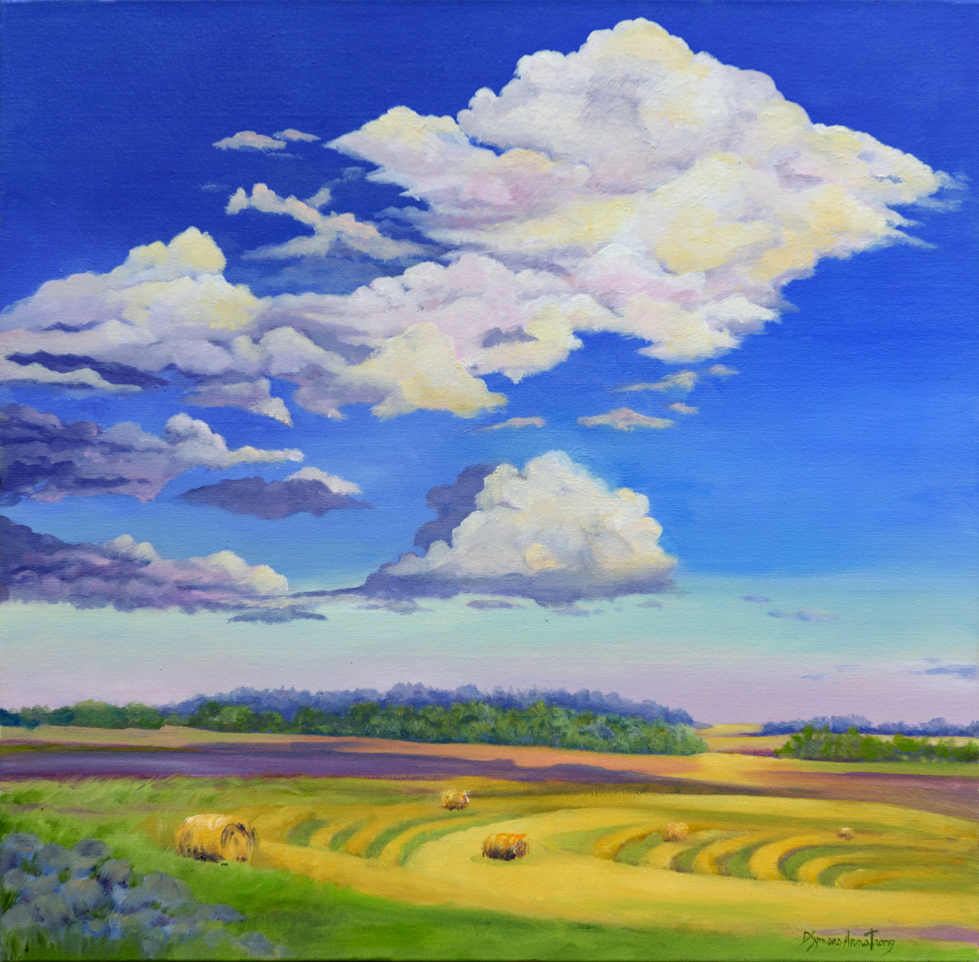 Hot Afternoon by Doris Symens-Armstrong  Image: “I am enthralled with the beautiful skies in South Dakota. Having been born and raised in northeastern South Dakota, I became aware at an early age of the vastness of the landscape. To me, this is what sets this state off from other states. My goal in this painting was to show the activity on so many farms in the summer and fall — the hottest time of the year.