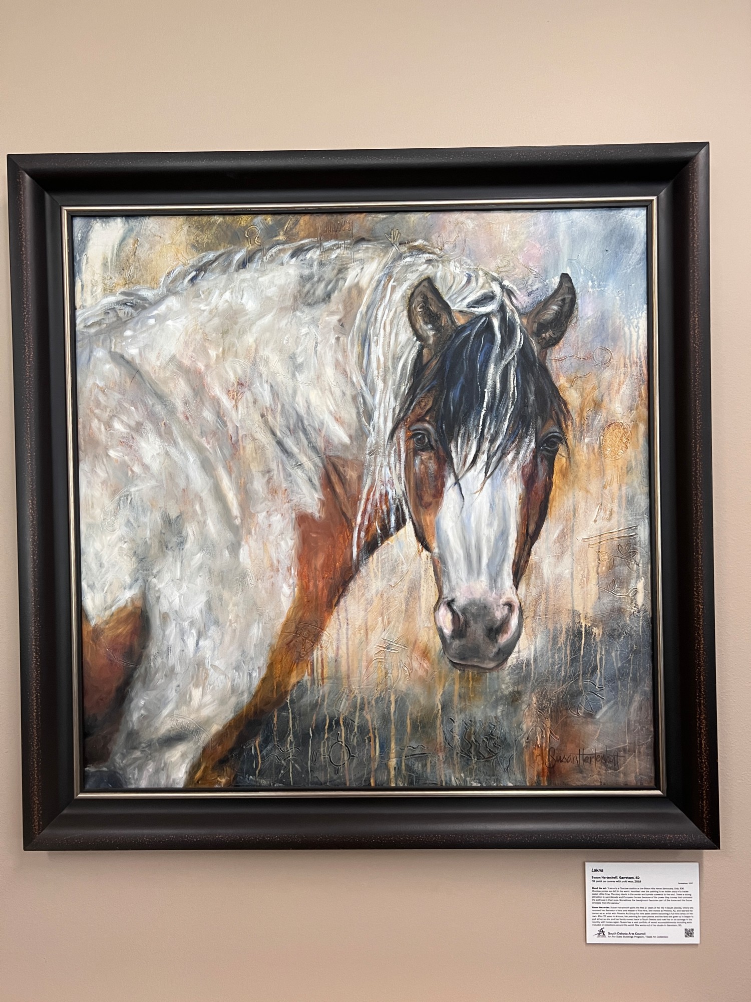 Lakna by Susan Hartenhoff  Image: “Lakna is a Choctaw stallion at the Black Hills Horse Sanctuary. Only 300 Choctaw ponies are left in the world. Inscribed over the painting is an Indian story of a trader called Little Crow. The story starts in the center and spirals outwards to the end. I have a strong attraction to warmbloods and European horses because of the power they convey that contrasts the softness in their eyes. Sometimes the background becomes part of the horse and the horse emerges from the canvas.”