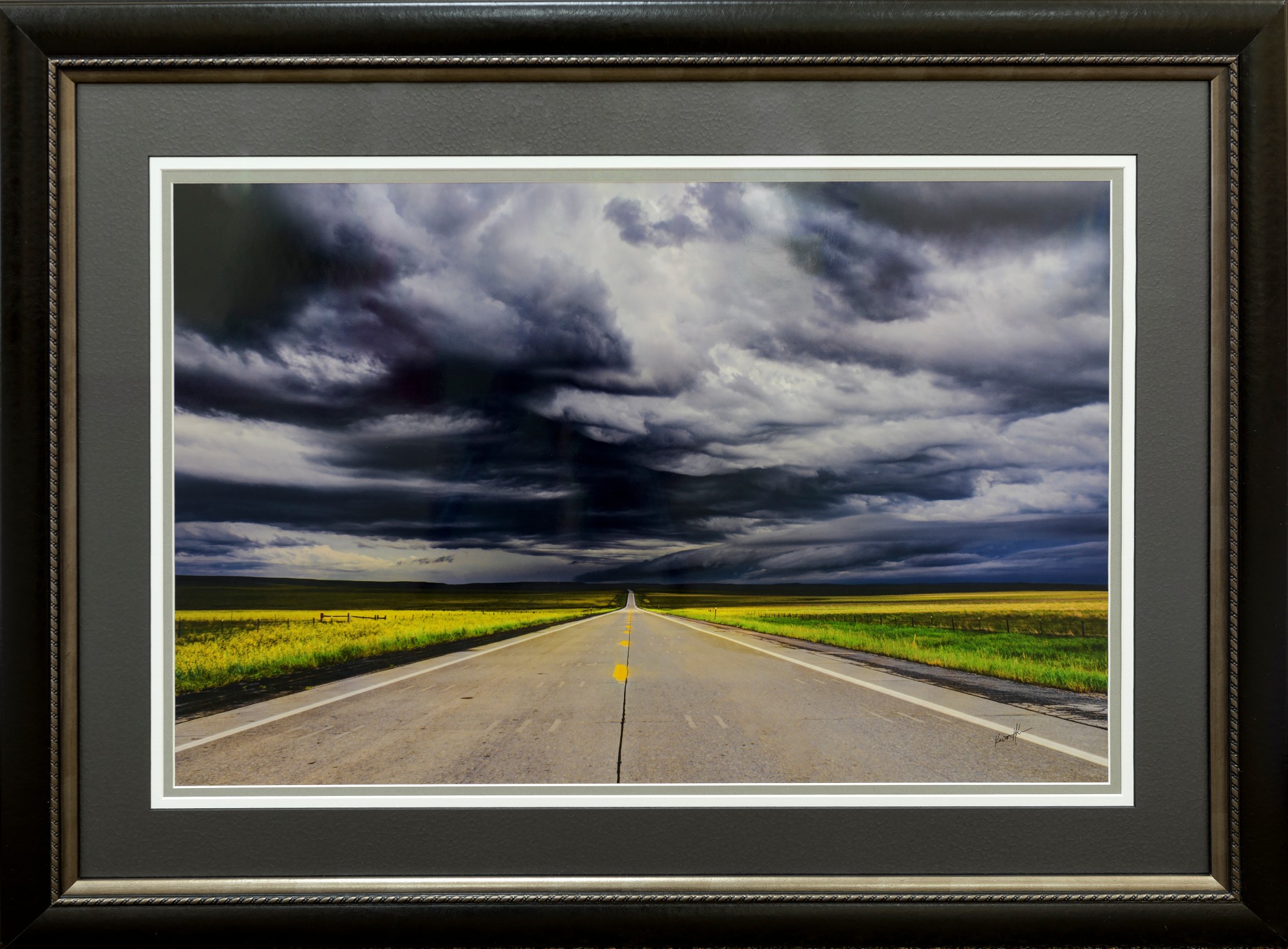 - Subject Matter: Horizontal landscape from ground level of a centered rural highway in perspective with incoming storm