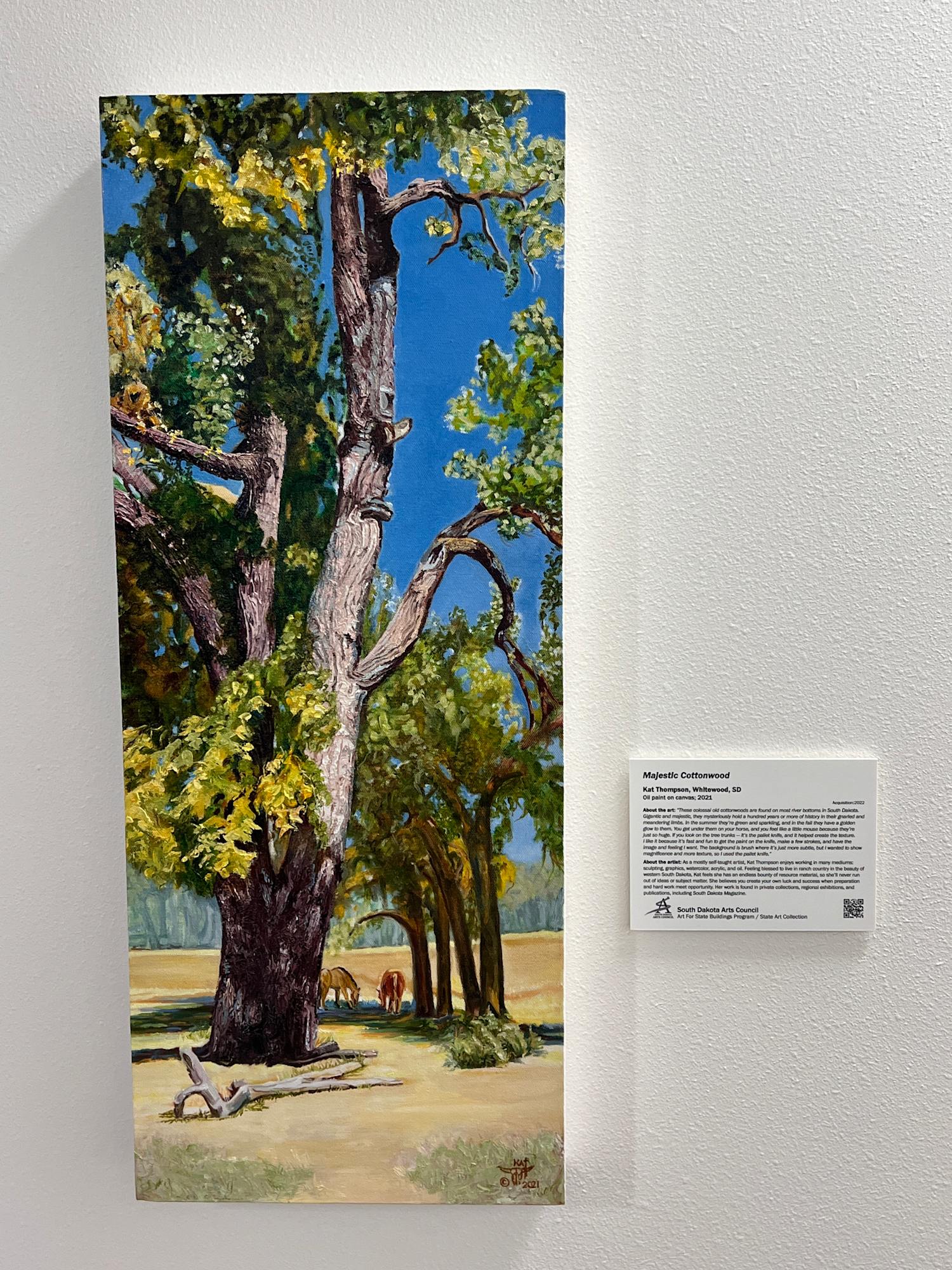 As a mostly self-taught artist, Kat Thompson enjoys working in many mediums: sculpting, graphics, watercolor, acrylic, and oil. Feeling blessed to live in ranch country in the beauty of western South Dakota, Kat feels she has an endless bounty of resource material, so she’ll never run out of ideas or subject matter. She believes you create your own luck and success when preparation and hard work meet opportunity. Her work is found in private collections, regional exhibitions, and publications, including South Dakota Magazine.