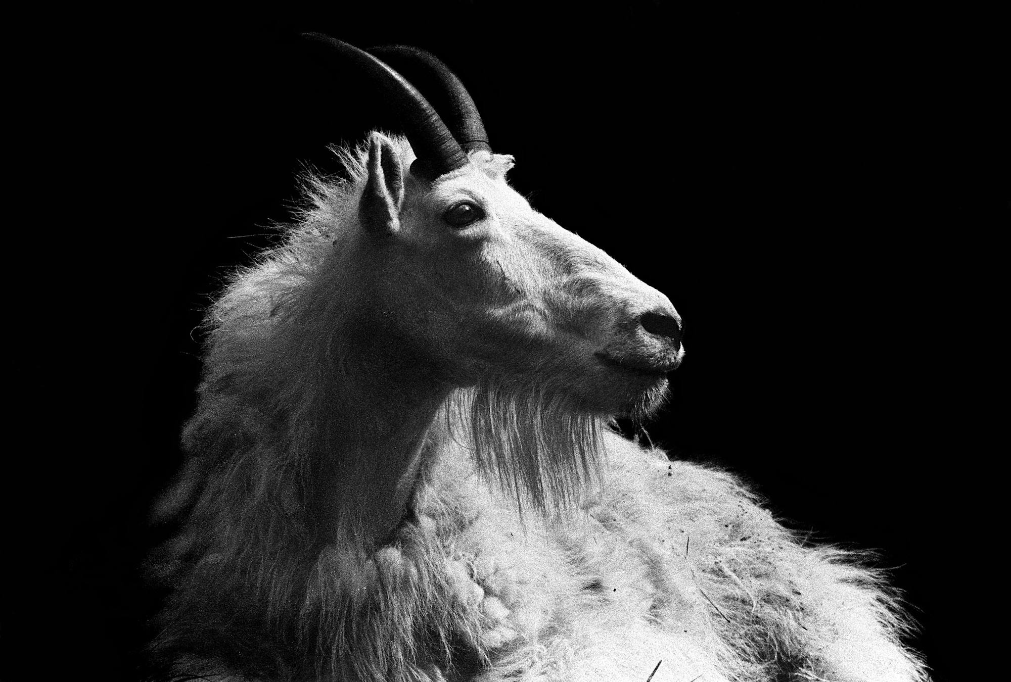 “Wildlife provides us with a visual exercise in light and shade. Using high-speed film and experimental dark room techniques, the animal was isolated from its natural habitat and surrounded with pure black. This allows the viewer to examine the rich texture of physical characteristics as well as personality. Although not native to South Dakota, the mountain goat has become a fixture in the rugged terrain of the southern Black Hills. This billy posed behind Mt. Rushmore with the confidence of the king of the realm.”