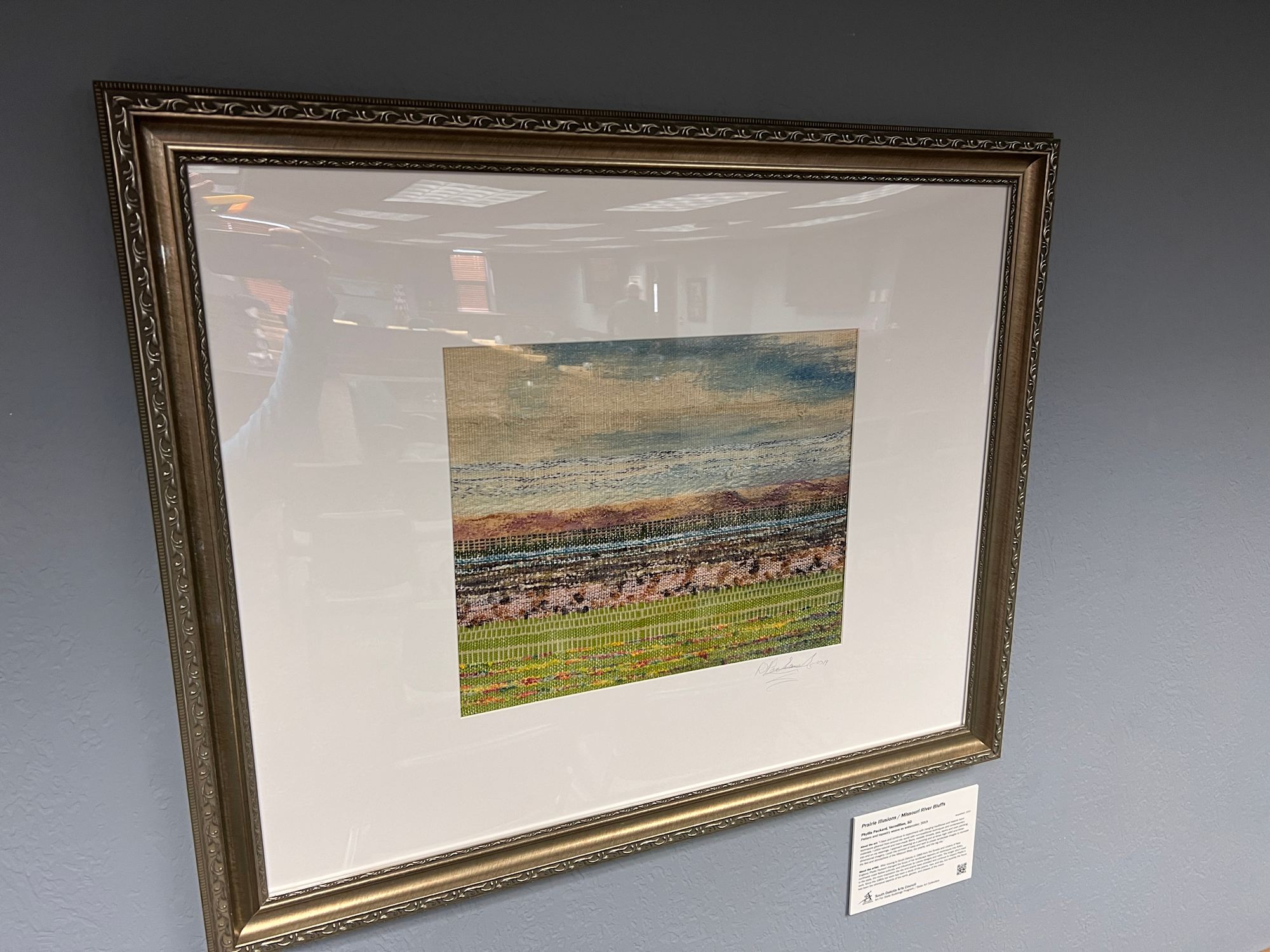 “I have and continue to experiment with merging traditional and historic loom techniques gleaned from around the world with non-traditional techniques and contemporary materials. I utilize natural and man-made fibers, metallic threads, dyes, stains and even painting into and on my weavings. I approach weaving as a painting and at times high relief and three- dimensional imagery. I push the concept of warp and weft to create landscape images to recreate the feel and atmosphere of the Missouri River, the prairie, and the big sky.”