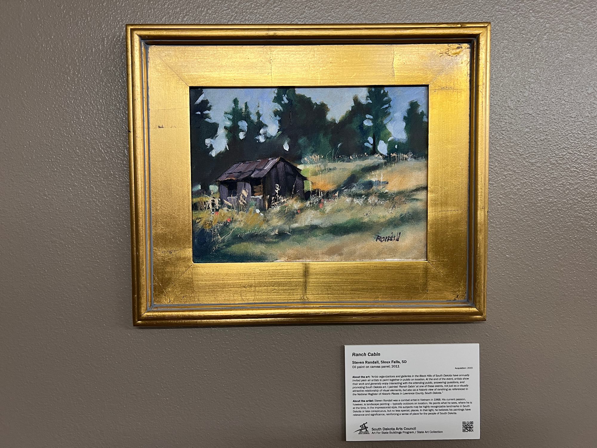 “Artist organizations and galleries in the Black Hills of South Dakota have annually invited plein air artists to paint together in public on location. At the end of the event, artists show their work and generally enjoy interacting with the attending public, answering questions, and promoting South Dakota art. I painted ‘Ranch Cabin’ at one of these events, not just as a visually attractive relationship of visual elements, but also as a historic view of ranching as referenced in the National Register of Historic Places in Lawrence County, South Dakota.”