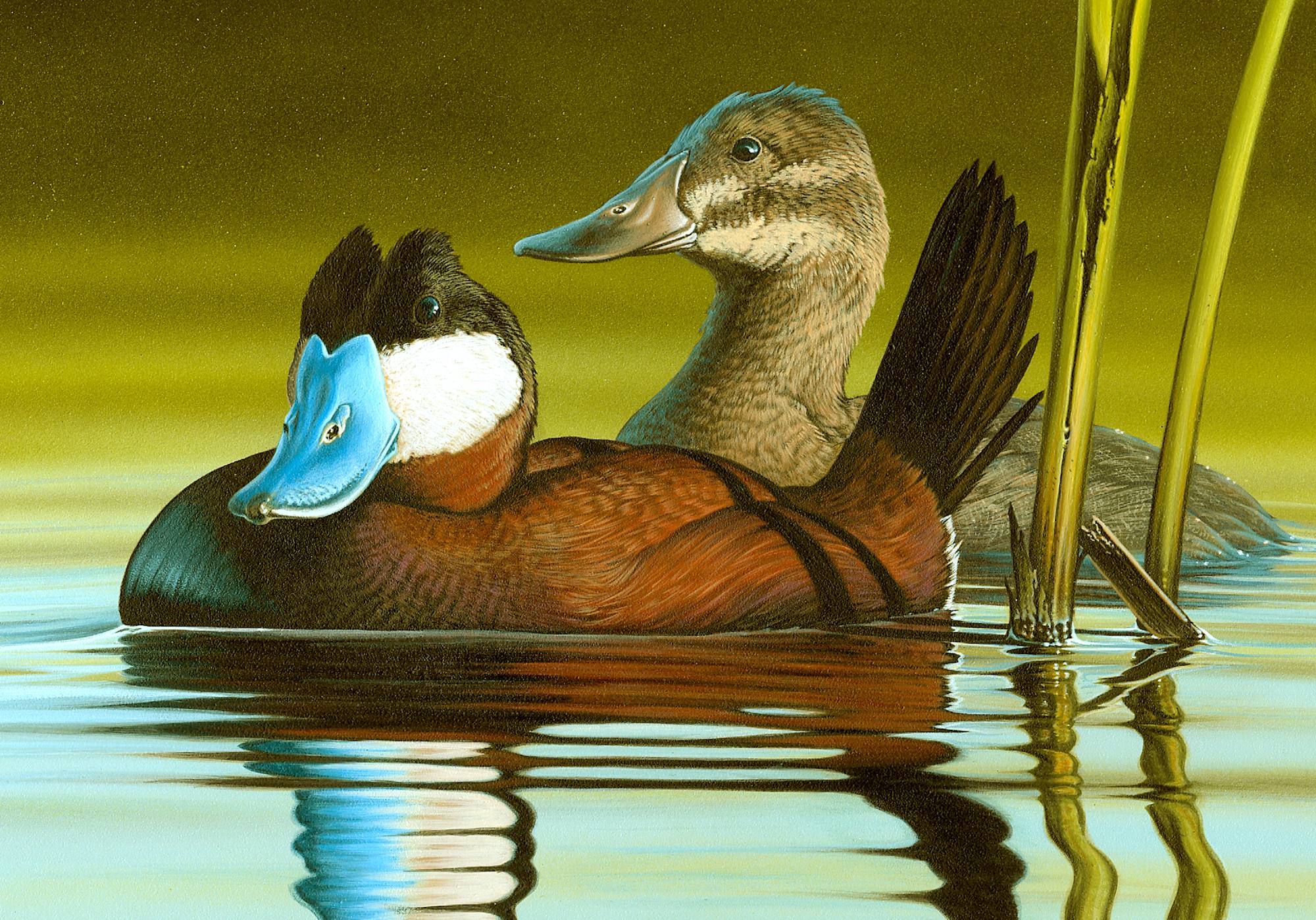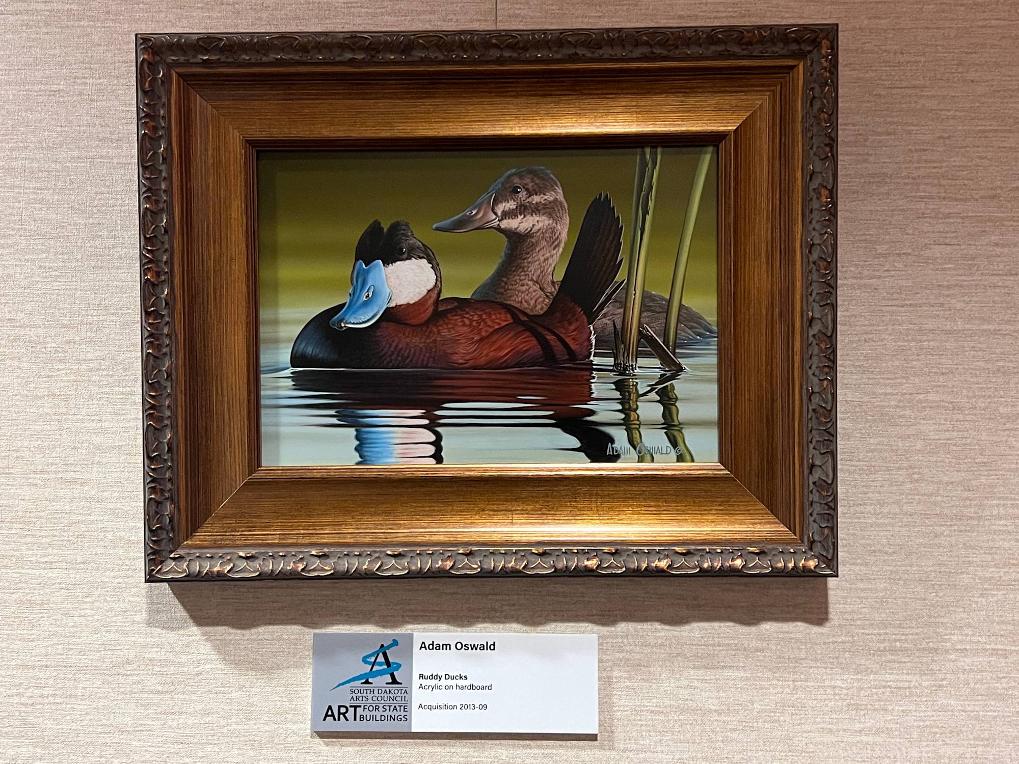 Ruddy Ducks by Adam Oswald  Image: “These colorful little ducks are plentiful in South Dakota’s marshes in the spring and can be seen during their courtship display when they ‘fan’ their tail and tuck their bright blue bill into their maroon-colored chest. This original was entered into the 2010 Federal Duck Stamp contest and finished fifth out of nearly 300 entries. The painting went on a year-long tour and was displayed along with the other top 20 entries at art shows throughout the country.”