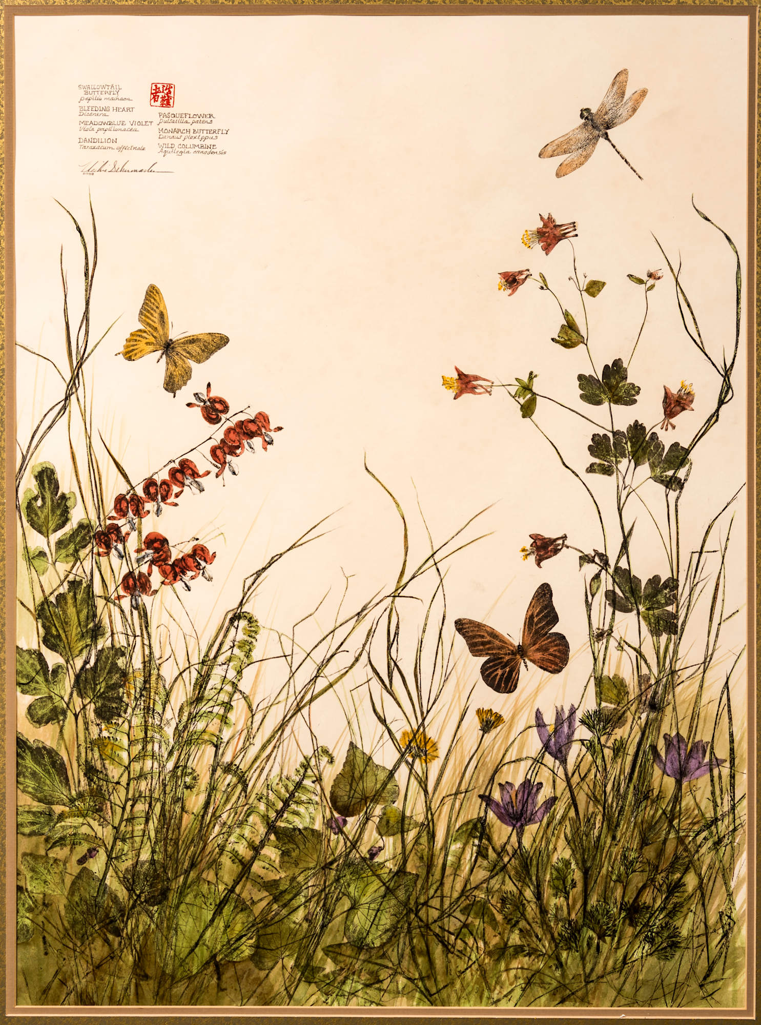 “I hope this nature print, in which actual plants and insects were inked then pressed into a surface to create a transferred image, evokes a feeling of soft spring breezes in South Dakota. When all the pieces are inked and printed onto the paper, they are hand-colored, usually with an acrylic wash. You will find bleeding heart, violet, dandelion, pasqueflower, wild columbine, a swallowtail butterfly, and a monarch. As in my other nature prints, this piece was printed using oil-based ink, with a color wash of acrylic paint added afterwards. The paper is stained to give the illusion of an aged botanical print.”