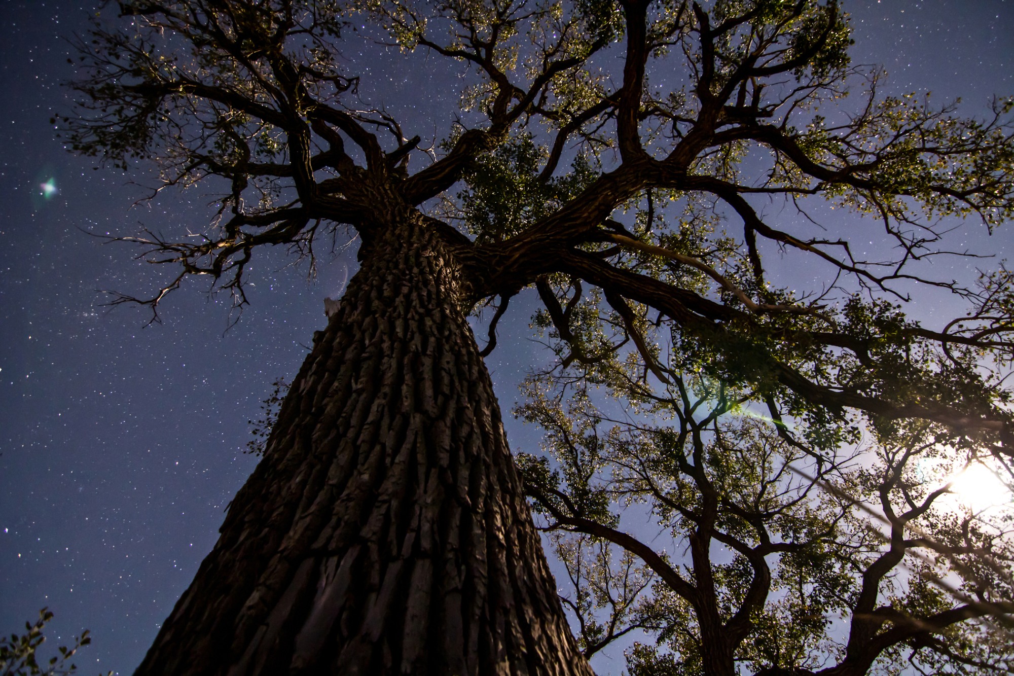 “This is looking up a big cottonwood tree illuminated by moonlight. The frame is from a time-lapse photograph taken with a DSLR Canon 5D Mark II. The shutter was open for 20 to 30 seconds allowing the camera sensor to gather more light than the eye can see, which makes the stars appear brighter than they are to the naked eye.”