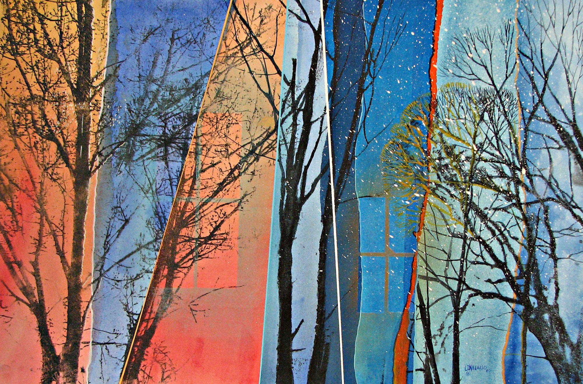 to capture feelings I get from those environments. Using elements and principles of design excites me while creating my art. Whatever the subject matter, it is the process of combining the elements–line, shape, color, form, and texture–with the principles–unity, rhythm, balance, and emphasis–into works of art that convey my sense of aesthetics. My subject matter has varied over the years, but there has been one recurring theme: trees. ‘Window’s View’ captures a moment in time for us to view the lines, shapes, and spaces which they create: a needed break from an otherwise monotonous northern prairie landscape.”