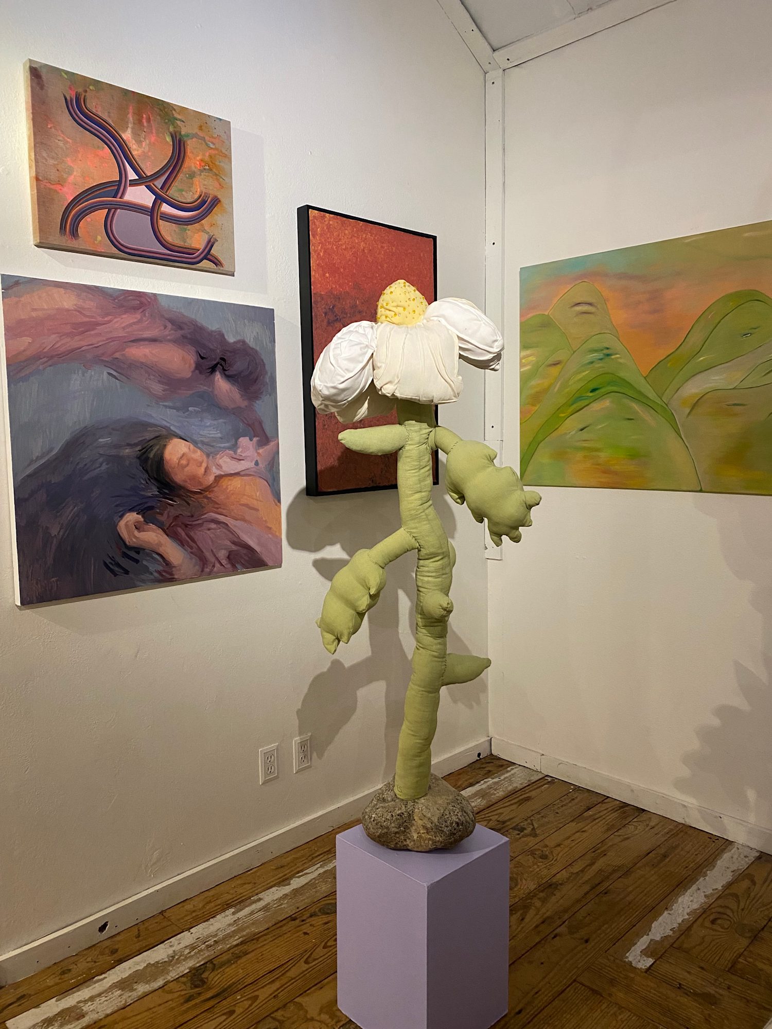 Repurposed cotton clothing, glass beads, polyfil stuffing, thread, wood, stone