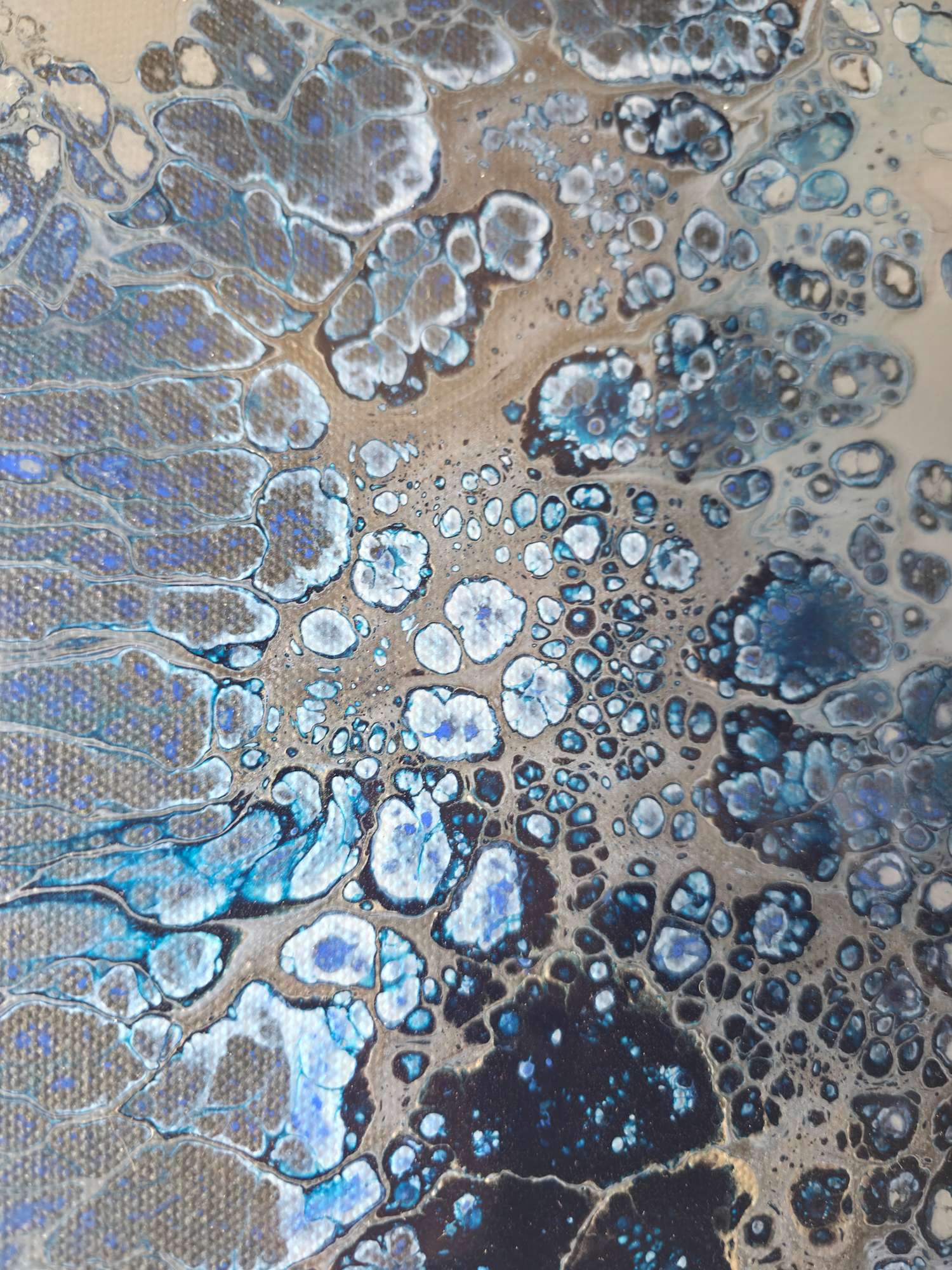 An 11x14 level 3 resin-sealed canvas where streams of cobalt and silver illuminate against a deep gray ground. The layered lacing suggests light breaking across moving water, echoing Psalm 36:9 - God as both the fountain of life and the true source of all light.