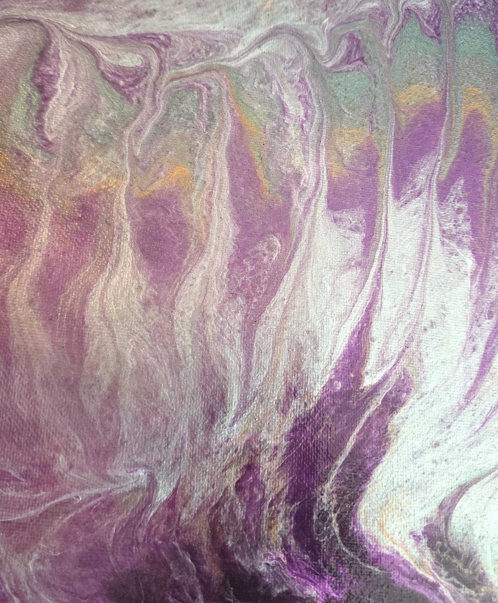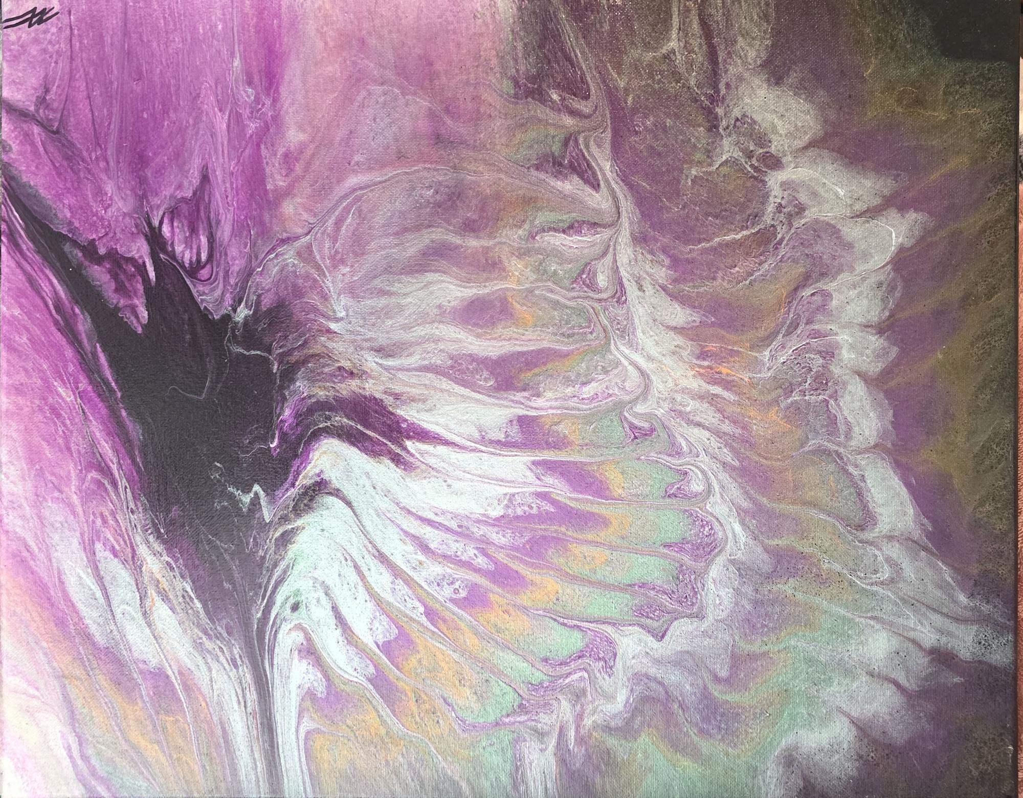 A moody, flowing composition of violets, greens, and soft iridescent undertones. The dark foundation curves upward into luminous forms, evoking mystery and quiet strength. Balanced, intentional, and gallery-ready, this piece embodies the theme of light breaking through shadow.