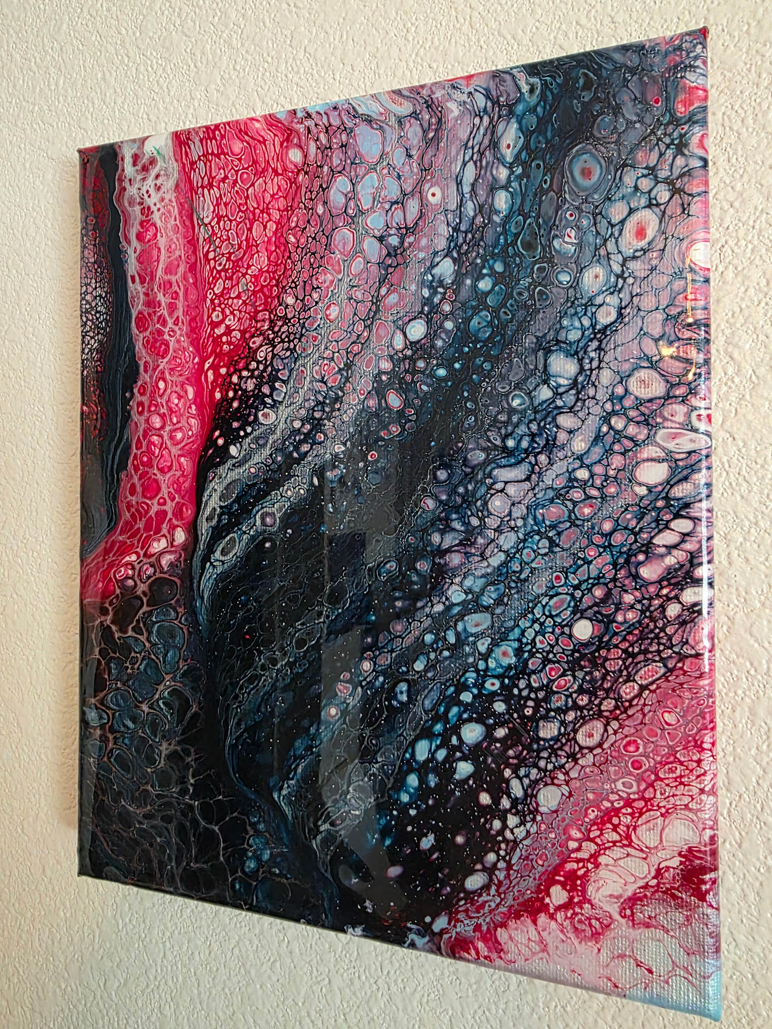 A resin-sealed 8x10 canvas with crimson, black, blue, and white lacing. The dramatic movement evokes the tearing of the temple veil, symbolizing access to God's presence through Christ. Resin enhances depth, detail, and contrast, giving the piece a bold sacred presence in a compact size.