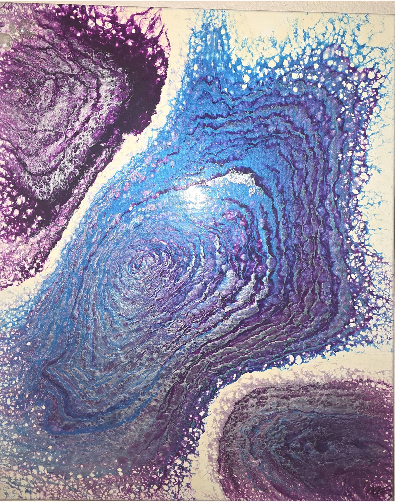 Flowing blue and black composition with metallic veins running through, symbolizing eternity and divine beauty. Rich contrast with shimmering details, sealed in Krylon finish.
