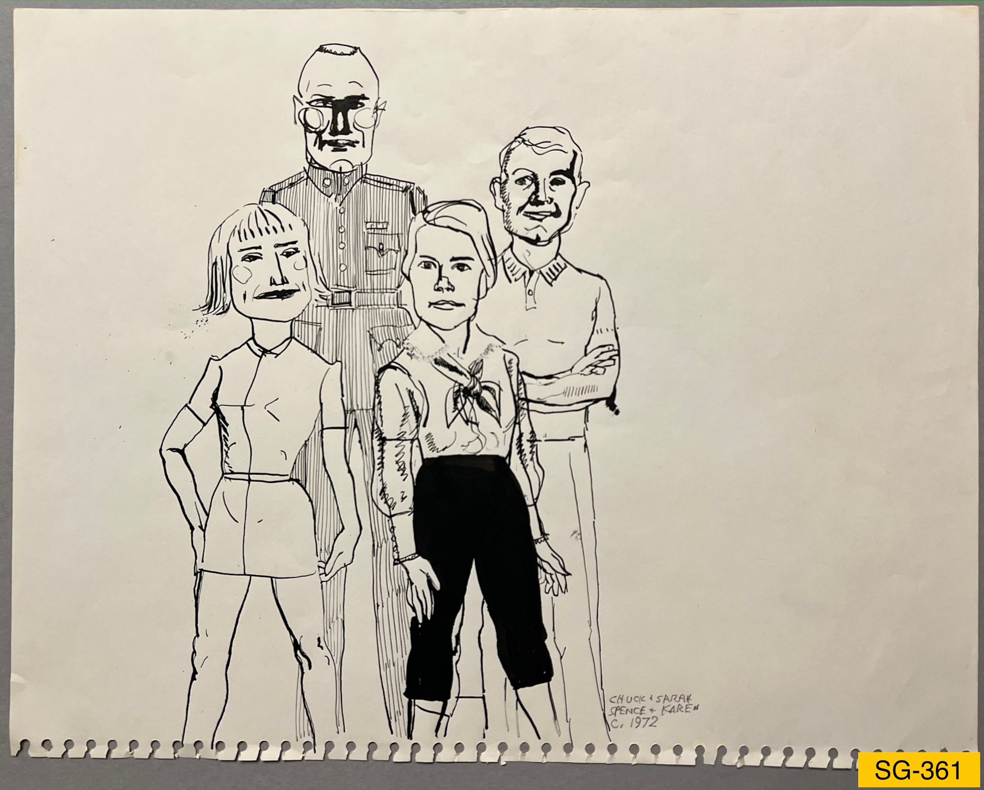 Caricature drawing of the artist and his wife, Karen Raley, with his brother and sister-in-law, Chuck and Sarah Guerin. Chuck is the taller man in U.S. Marine uniform.