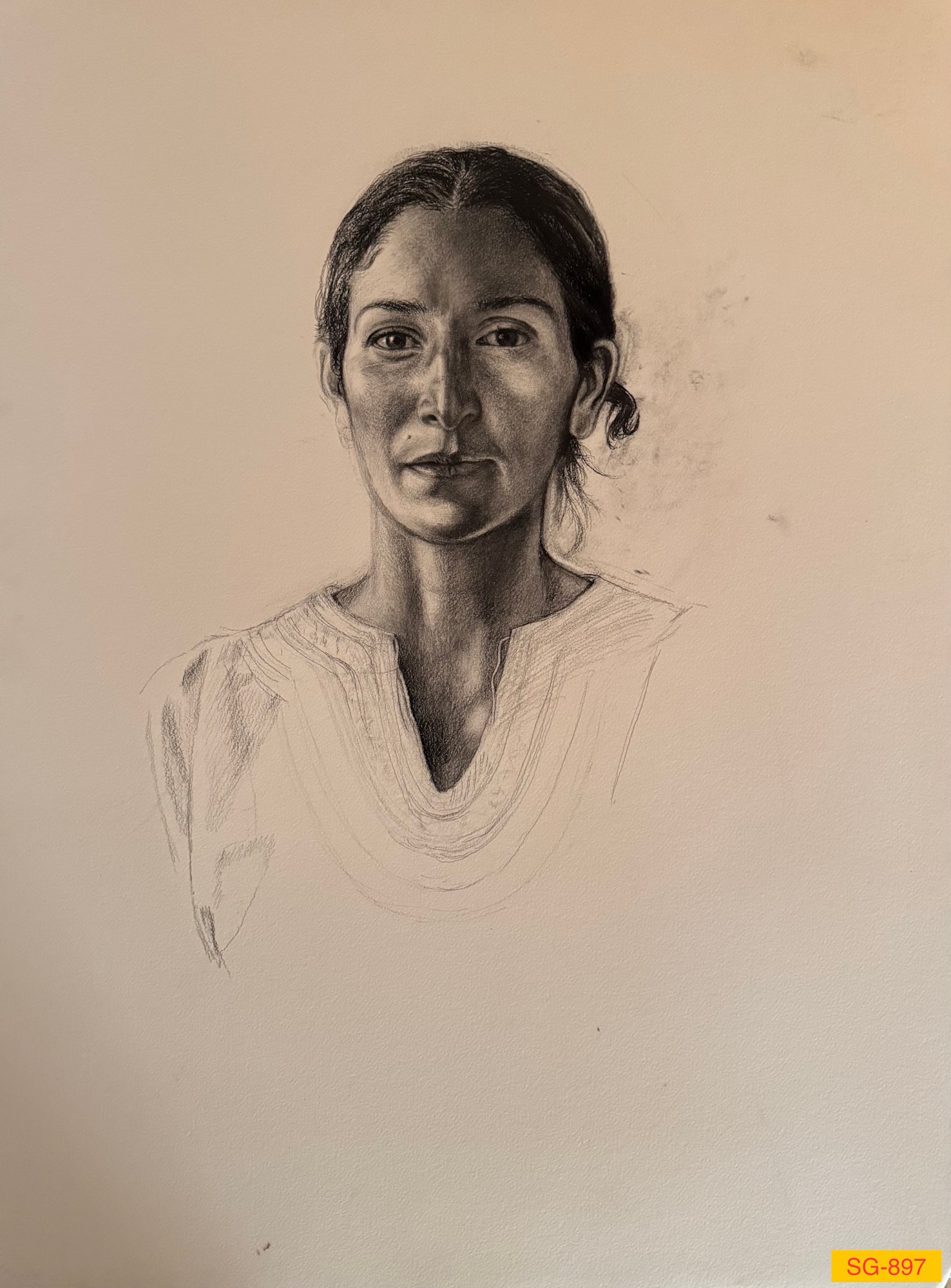 Portrait drawing of a young woman, college student from Mexico and friend. Unfinished drawing. On Arches watercolor paper.