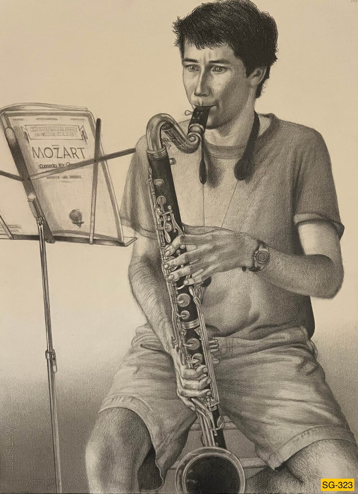 Neighbor Jack Goffinett playing a saxophone. On Fabriano paper.