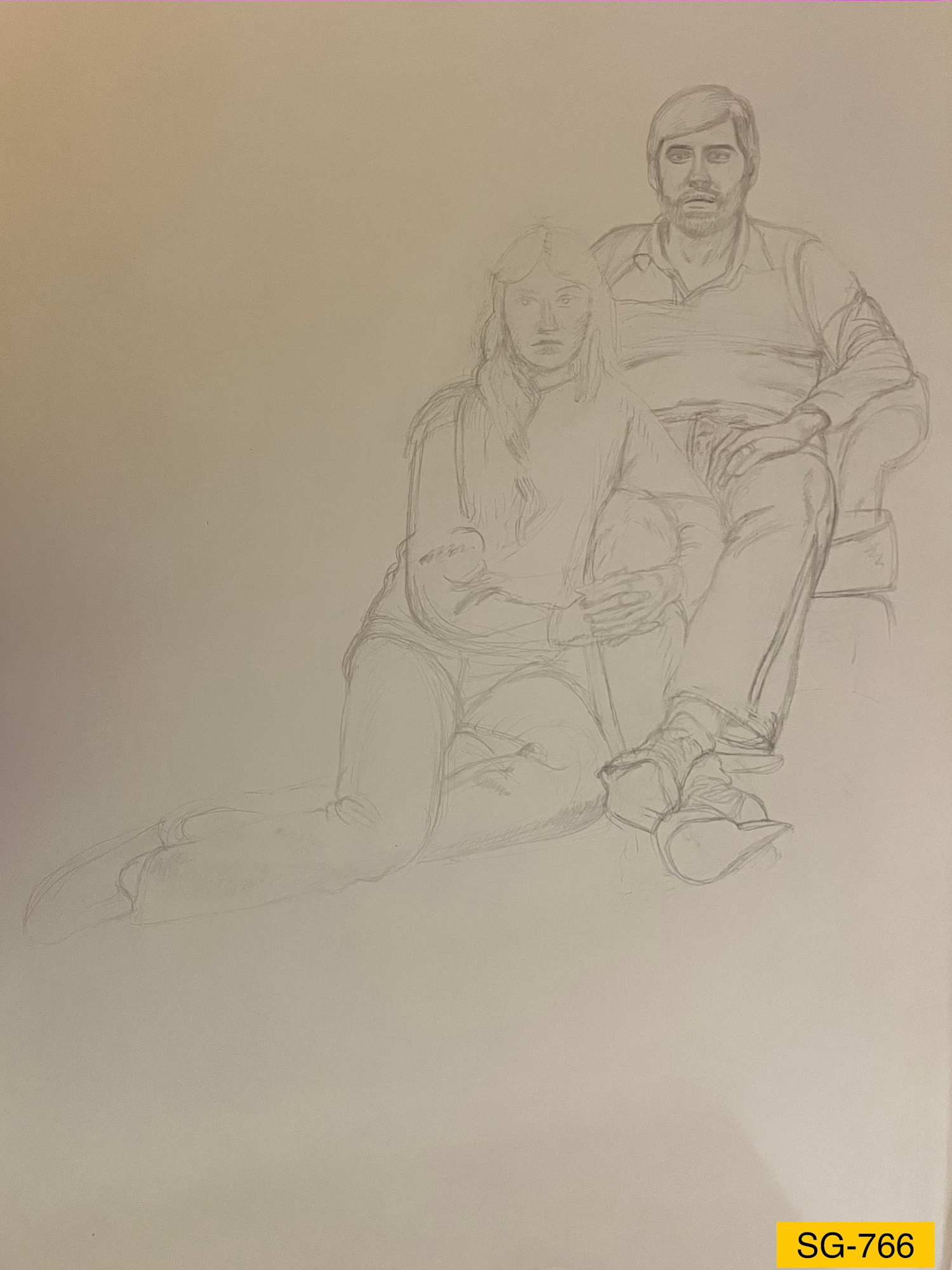For about a year in the mid-80s in his downtown Anchorage warehouse studio, the artist did drawings of this couple, both clothed and nude. The work eventually became a large painting with life-size naked, entwined figures, oil on linen 48 x 96 inches. At the same time oil prices and the economy of Alaska unfortunately collapsed, and the couple had to move back to the Lower 48 before the painting was completed. Another grand Alaska story. Eight related drawings: SG-762, 763, 764, 766, 767, 768, 768 and 910.