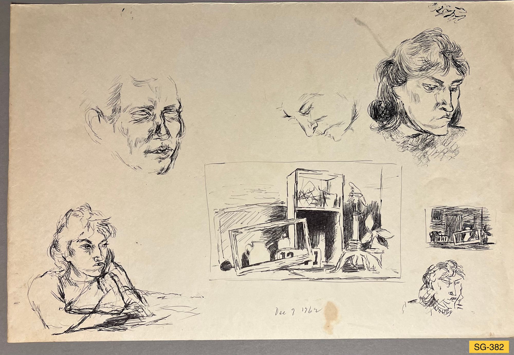 Multiple sketches of fellow student, Mary Darr, a sketch of a man, a sketch of a still life set-up, and a sketch of the interior of the studio (right, above sketch of head at lower right).