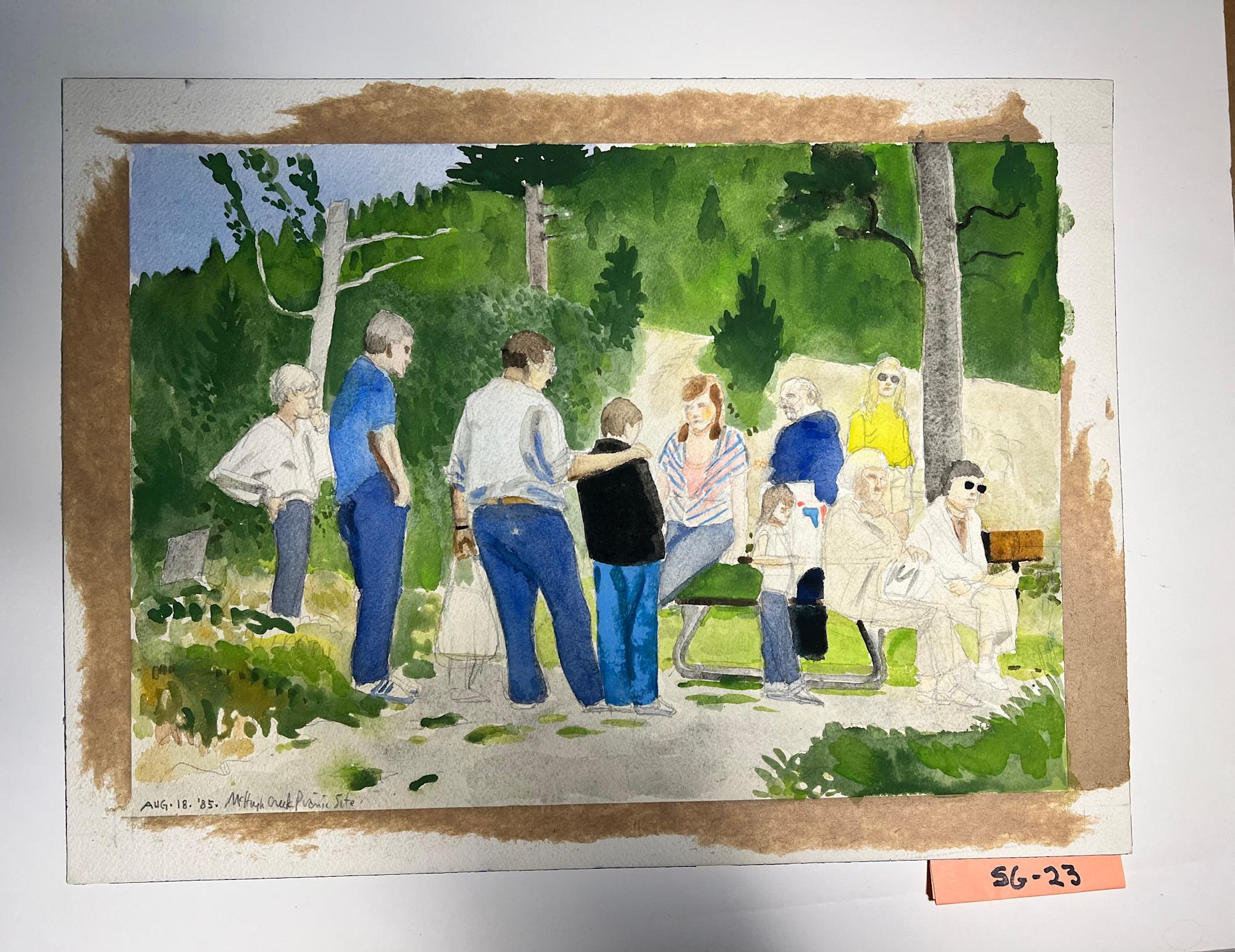 People gathered at a park bench in McHugh Creek Picnic Site along Turnagain Arm south of Anchorage. Looks like a whole family, looks like a serious discussion may be happening, does not look like everybody is happy. Paper on Arches watercolor block was stretched on a board with paper tape residue still on the watercolor paper, defining the image.