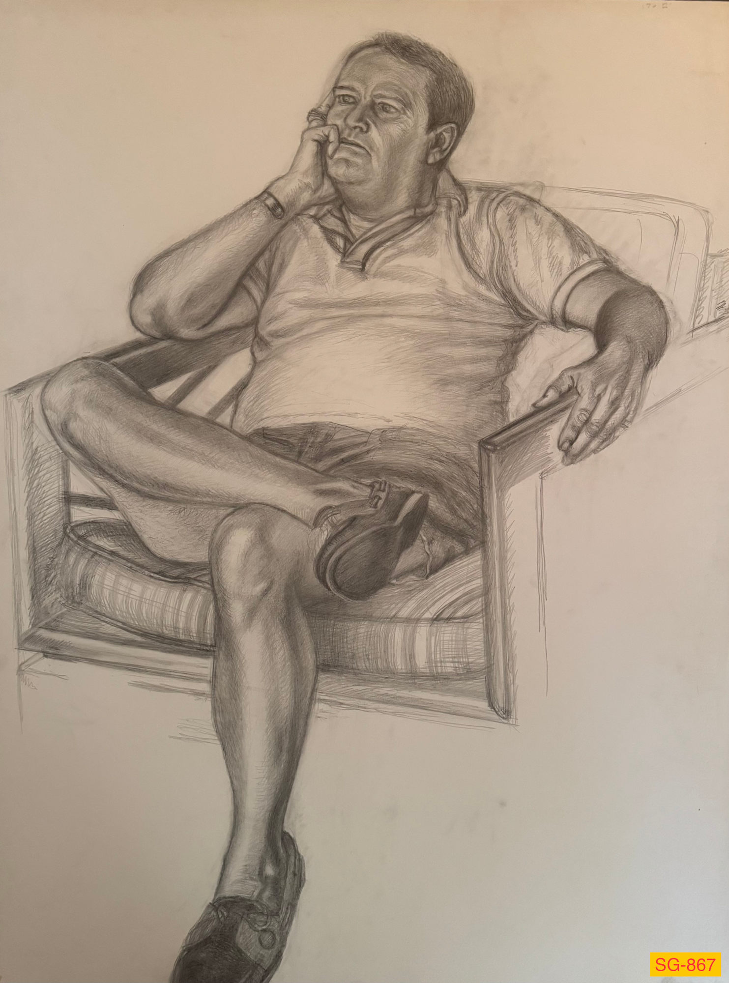 Tom Sawyer was our good neighbor, seated here in living room chair. Tom sat for many drawings like this. Paper: Fabriano 50 percent cotton. Also see SG-866, Tom in almost the same pose.