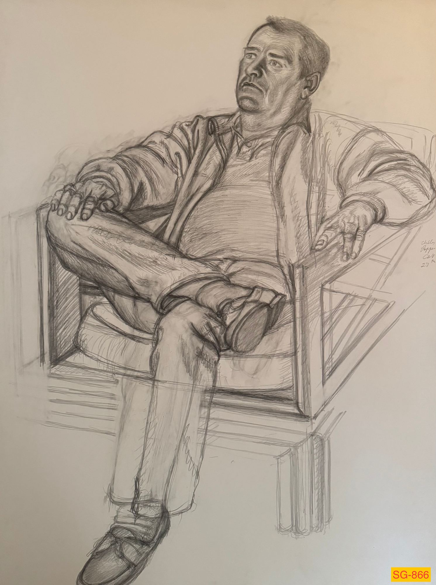 Tom Sawyer was our good neighbor, seated here in living room chair. Tom sat for many drawings like this. Annotation at right edge midway down: "Chilly Pepper Club...27th" may have referred to a singing gig for Tom, who sang at some piano bars and also taught ballroom dancing, in addition to working at a building supply store. Paper: Fabriano 50 percent cotton. Also see SG-867, Tom in almost the same pose.