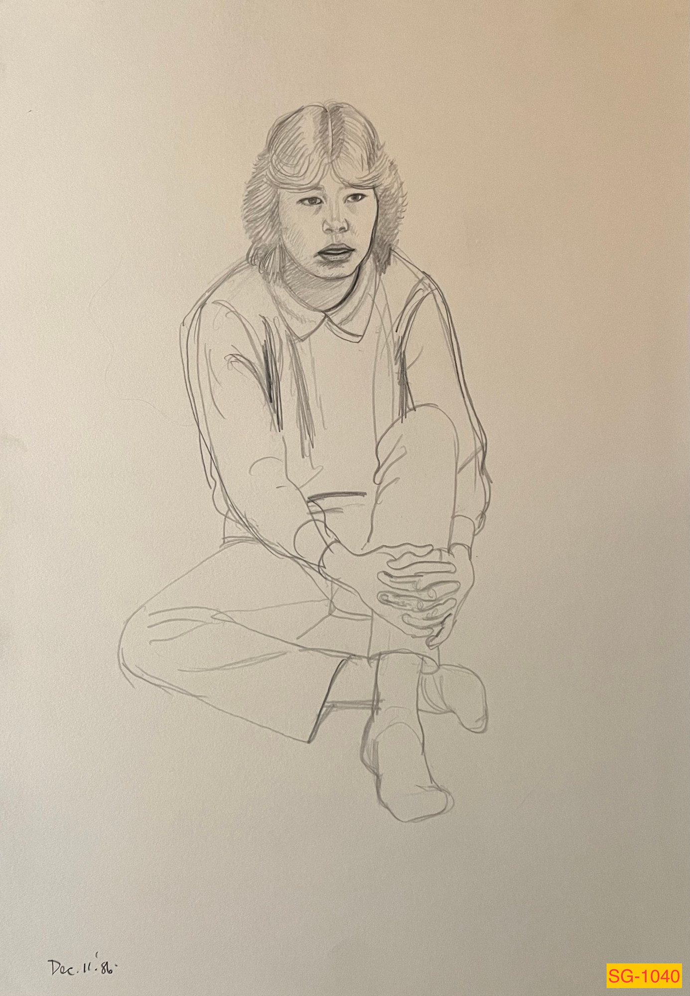 Female figure model sitting with hands wrapped around knee.