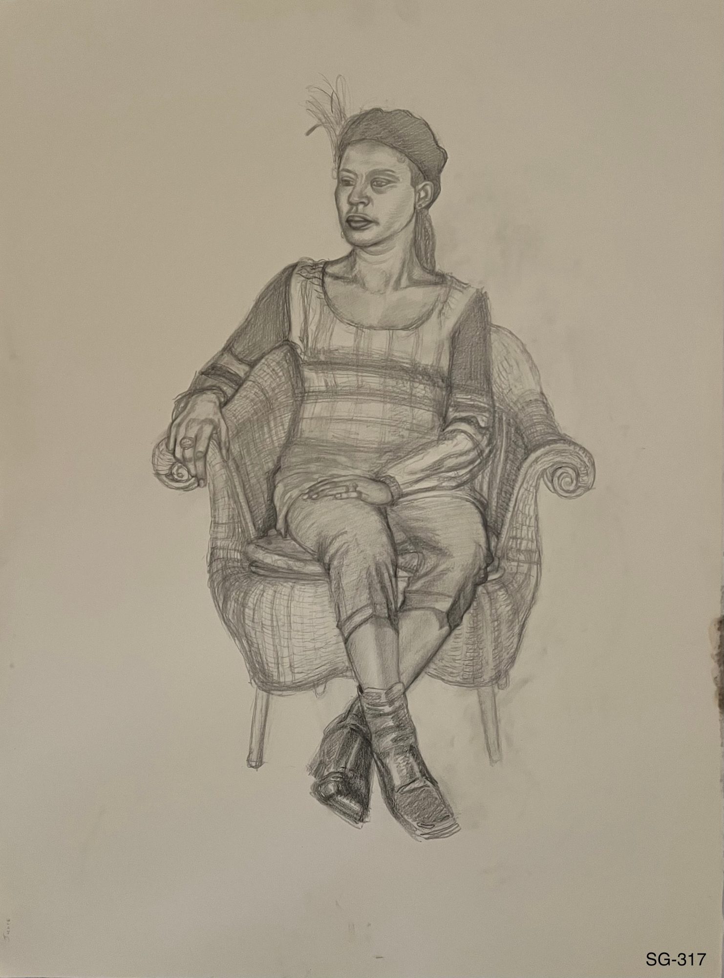 Female model sitting in chair wearing a hat with feathers on it. The name Julie is written on the left edge of the paper.