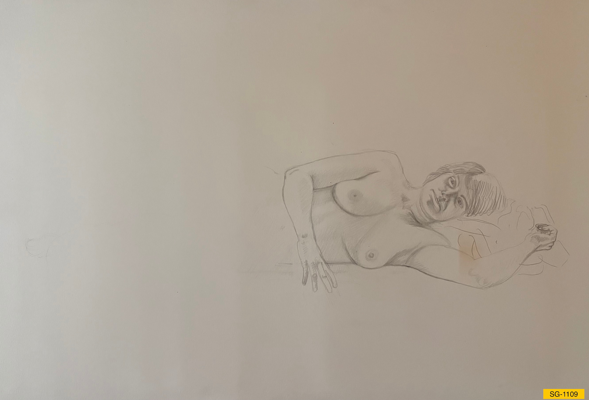 Nude female model laying prone facing the artist