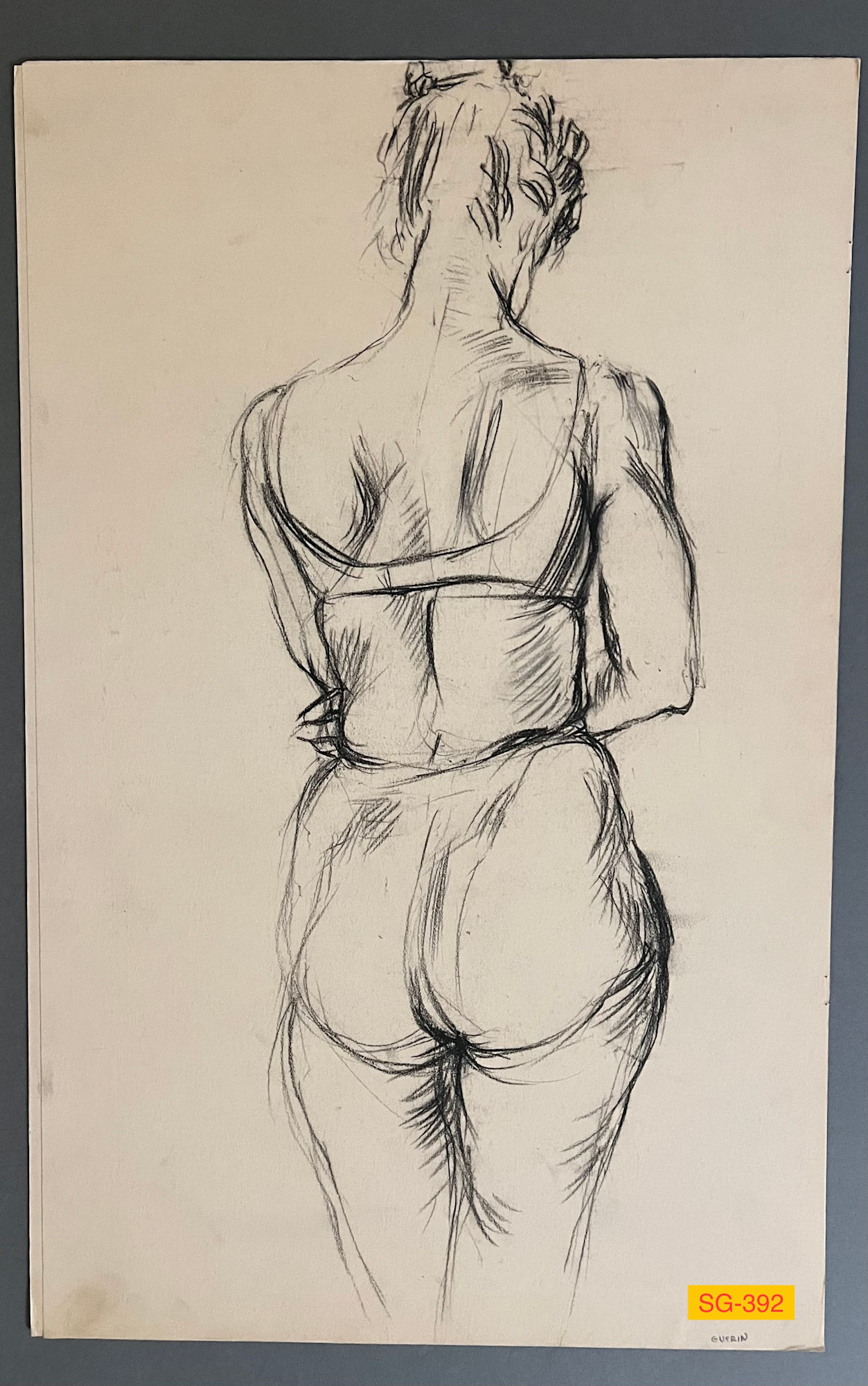 Female model standing with back towards the viewer. Professor Hill selected this drawing and dry mounted it for student exhibition. On unknown paper, dry mounted. Not spray fixed.