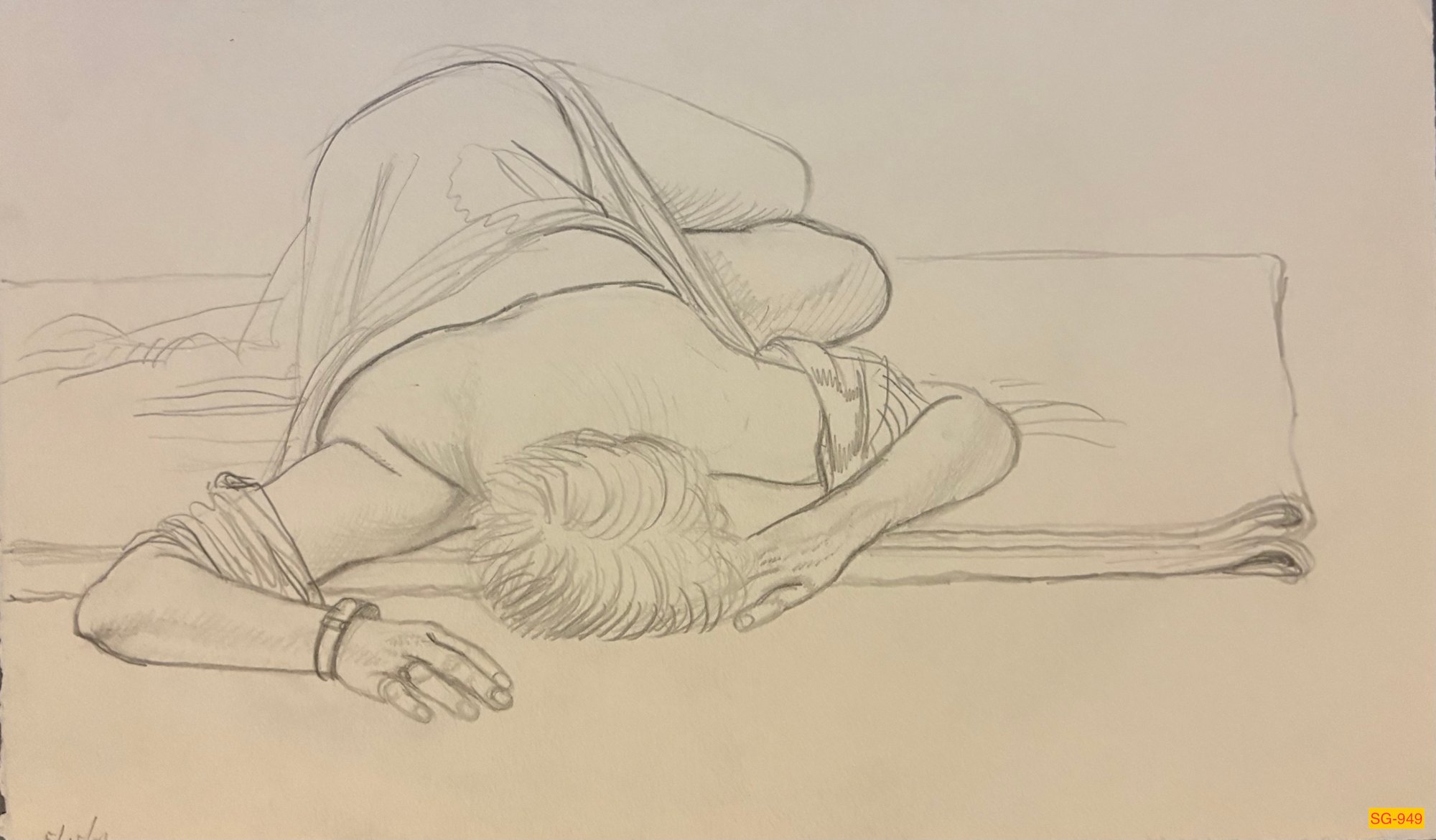 Nude female model lying on a folded blanket on the floor. She is in a twisted position, lying on her hip with legs to the side, upper boy turned to the floor. Her head toward the artist, hands visible at her head. On BFK Rives Grey.