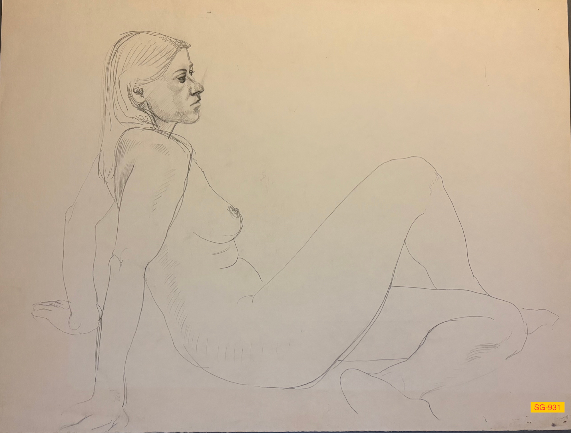 Nude female model sitting on floor, at weekly figure drawing session at Visual Arts Center of Alaska in Anchorage. Paper is not identified, may be Lenox 100.