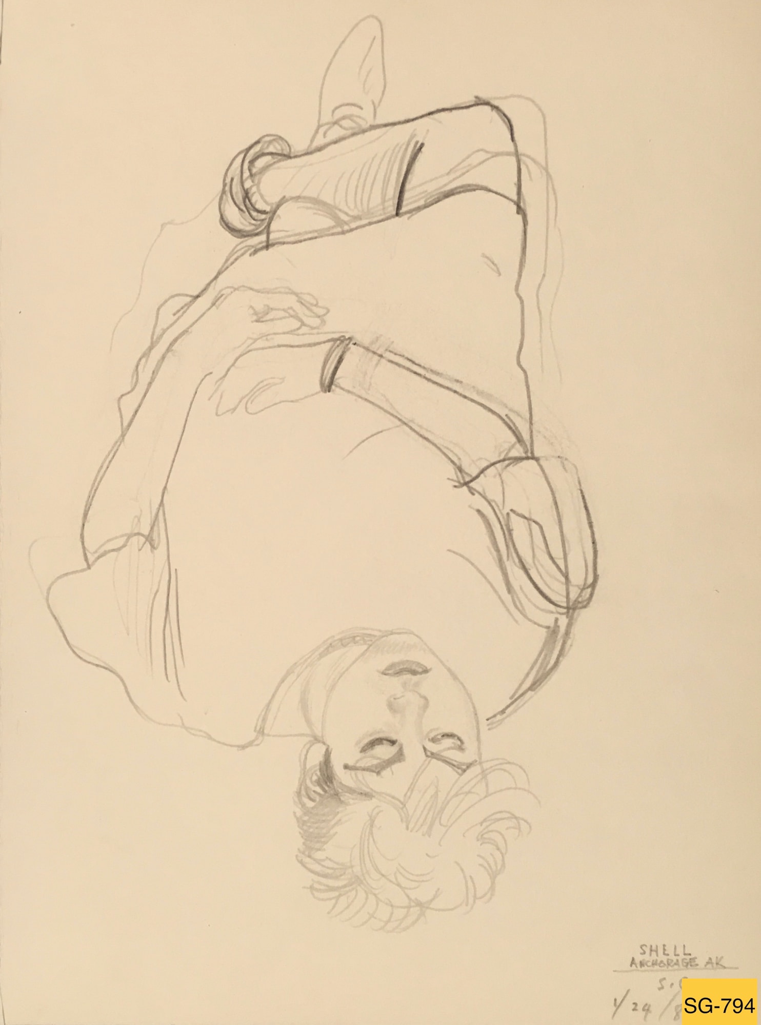 Female model named Shell, 2 of 2 drawings of Shell on this date, on same sheet of paper. At inventory, paper divided into two pieces. Drawing 1 of 2: SG-793, Shell seated on floor. Drawing 2 of 2: SG-794, Shell lying on floor, head to artist. On Lennox 100. On verso: Shell. 1/24/1985, Drawing 2 of 2.