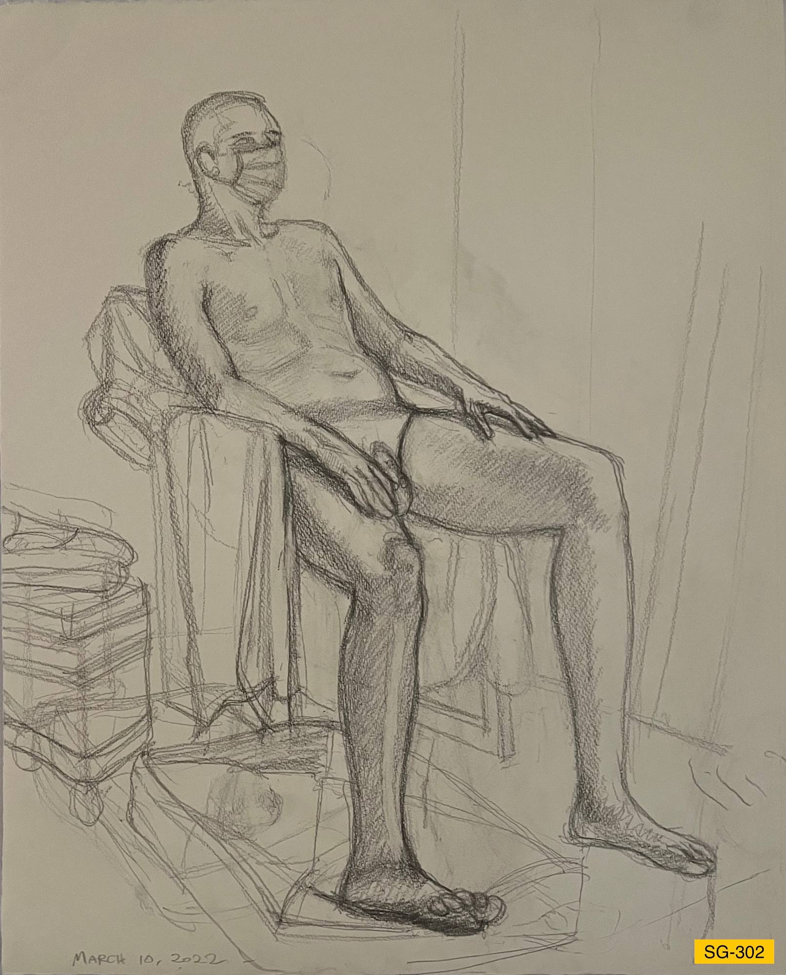 Nude male model in chair with a mask on (during COVID)