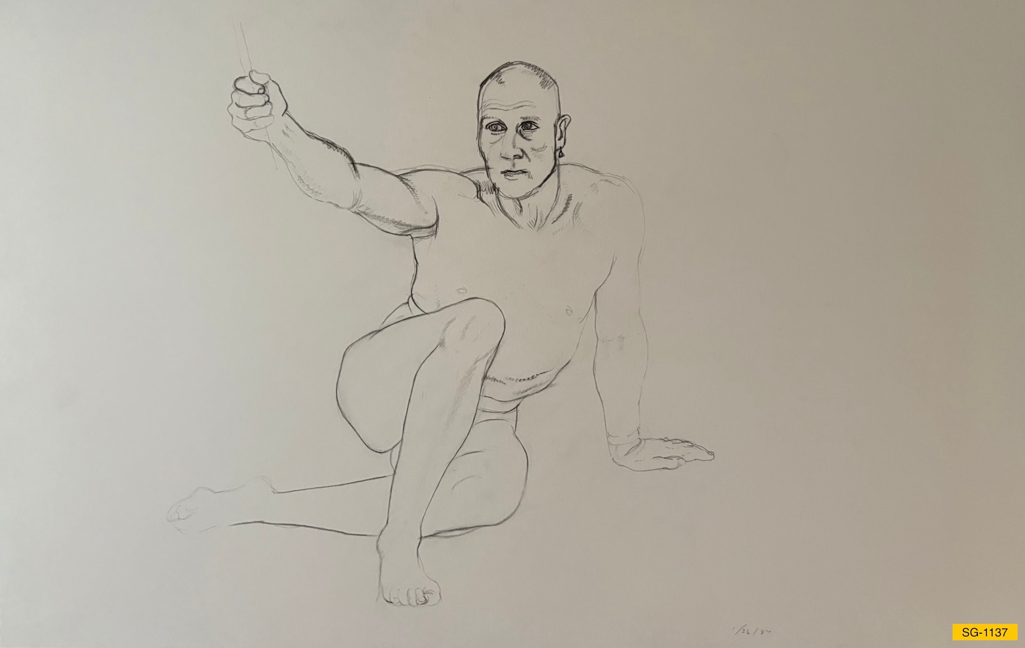 Nude male model sitting with one knee up and arm outstretched