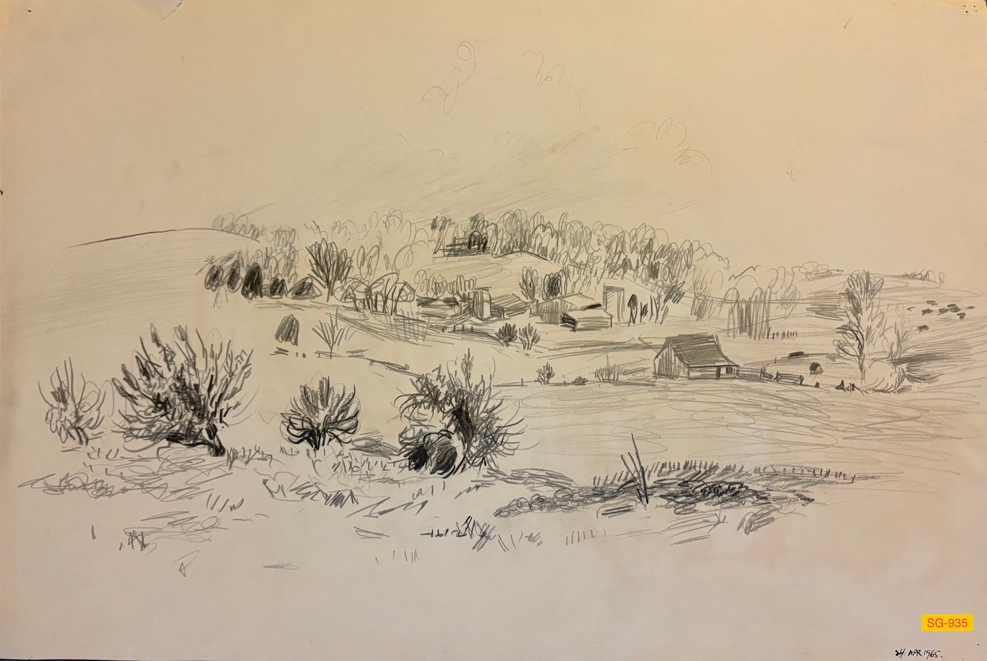 Landscape of countryside somewhere near Fort Knox, Kentucky in April, 1965, in the month before the artist was discharged from active duty in the US Army. On unidentified paper. / On the verso, printed in pencil: I was at Ft. Knox my last 8 months in the U.S. Army. Discharged early May 1965. On Sundays I often took a drive in the countryside, doing quick drawings. Many good memories of people in + out of the Army. Spence Guerin. (in signature script) at inventory time, April 2025.