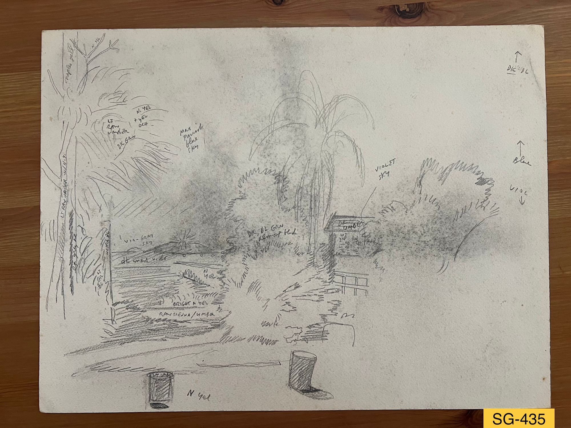Sketch of what appears to be a Florida landscape, with numerous notes about colors, including pigment colors, to be used in a potential painting of the subject.