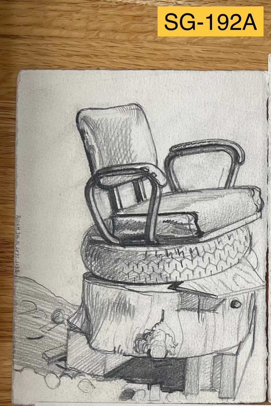 Drawing of a makeshift outdoor chair - the seat from a vehicle on top of a tire, on top of a slice of tree trunk, on top of blocks. In driveway of artist's studio on Holobinko Rd in Wasilla.