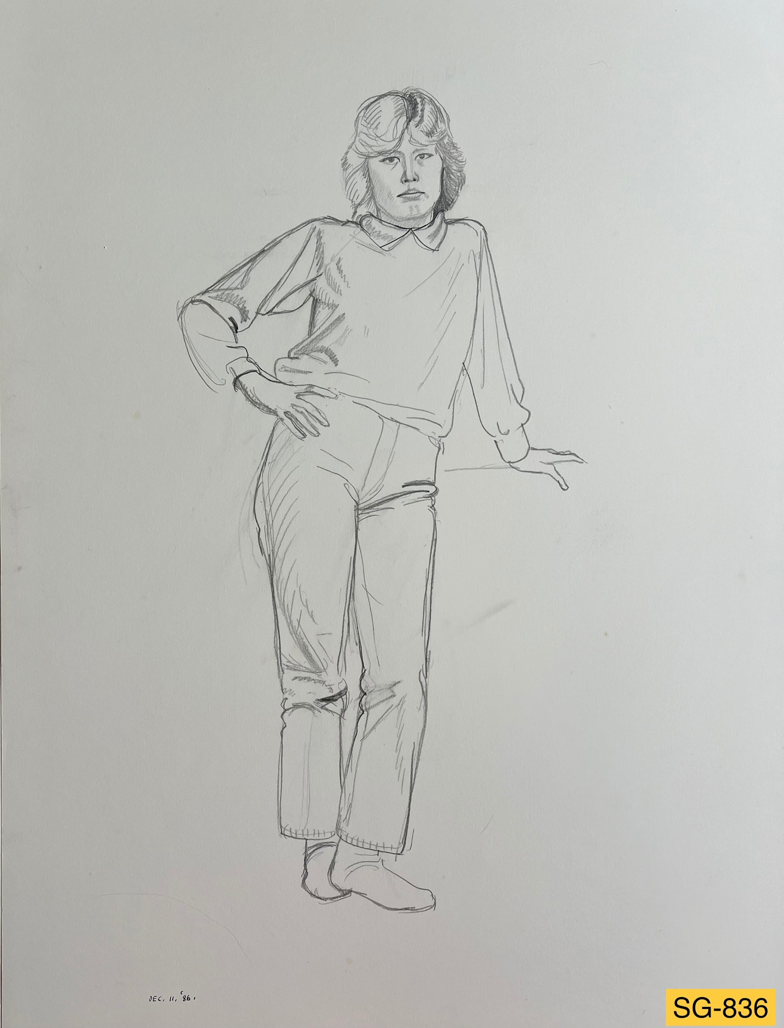 Young woman standing, clothed, wearing socks but no shoes. Leaning on a table with left arm extended, left hand on the table. Her right hand on her hip.