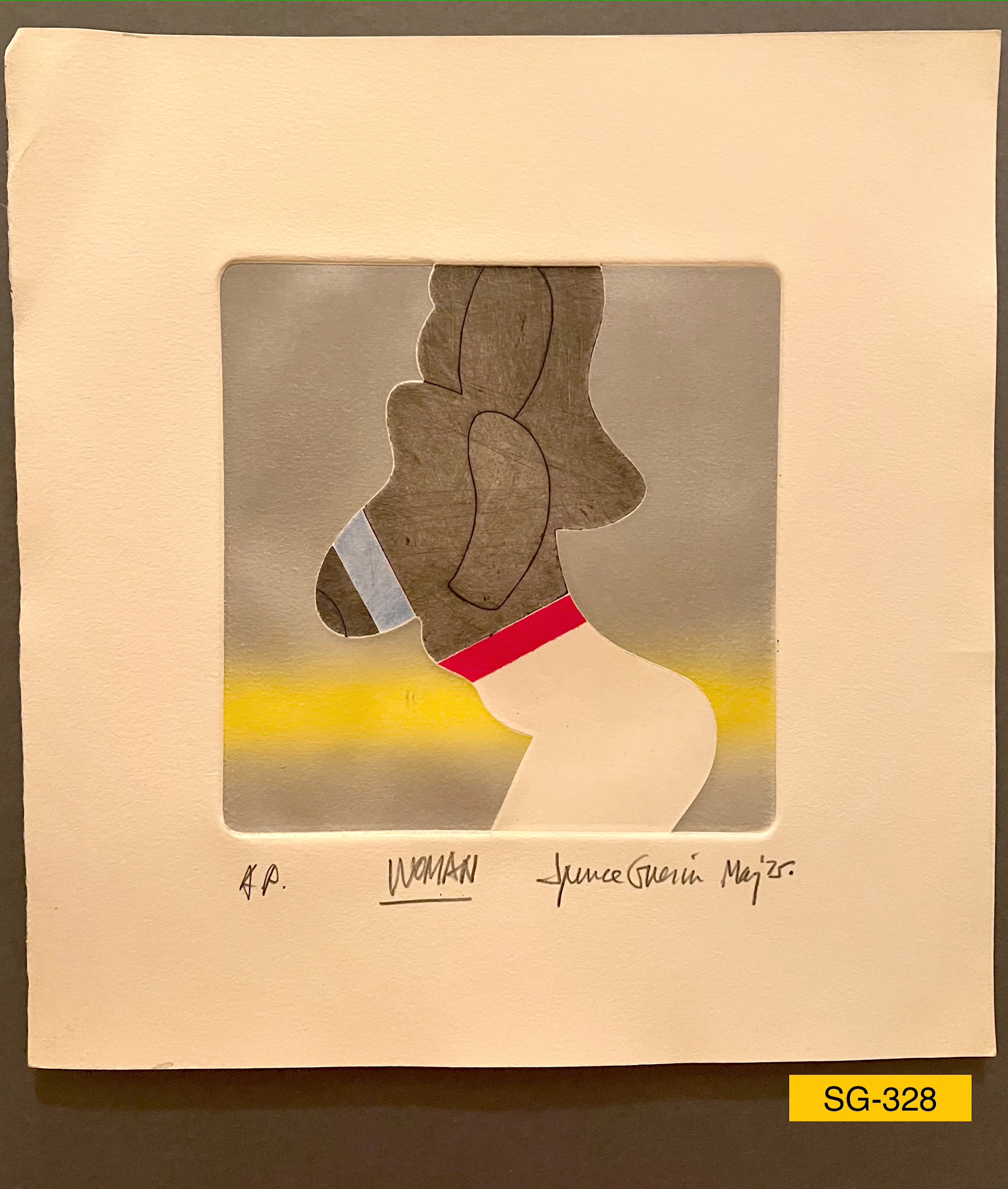 At the Visual Arts Center of Alaska, artist Ron Viol was the printmaking studio manager when Spence Guerin started working there in 1975. Ron was doing some print images created from "puzzle-cut" pieces of etching plates, inked separately, combined together into one totally inked image composition and printed in one run through the etching press. "Woman" was created in that way.