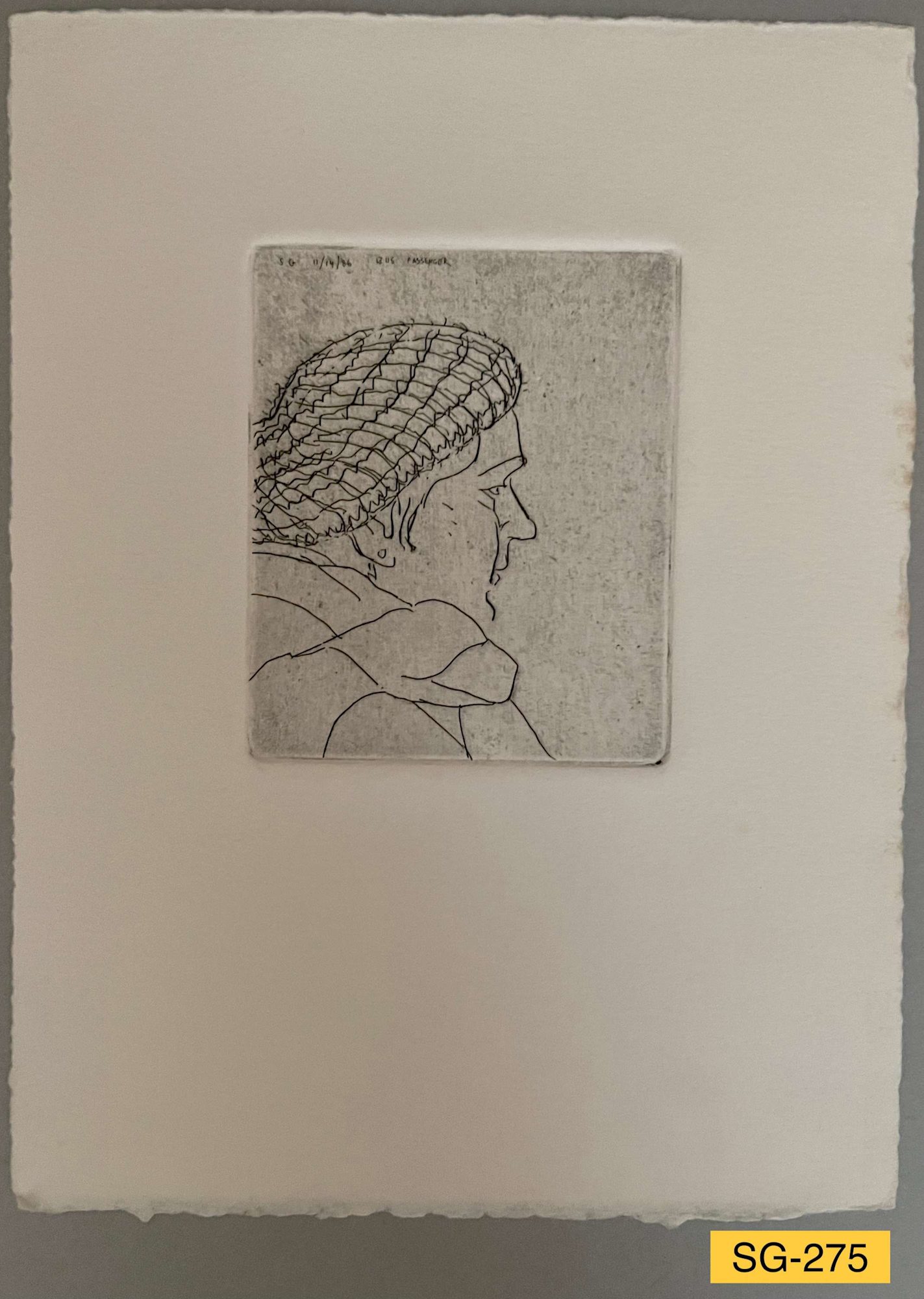 Woman in a knitted cap, with an earring. From the Bus Passenger Plates in Suite 101, 101 small etchings and drypoints.