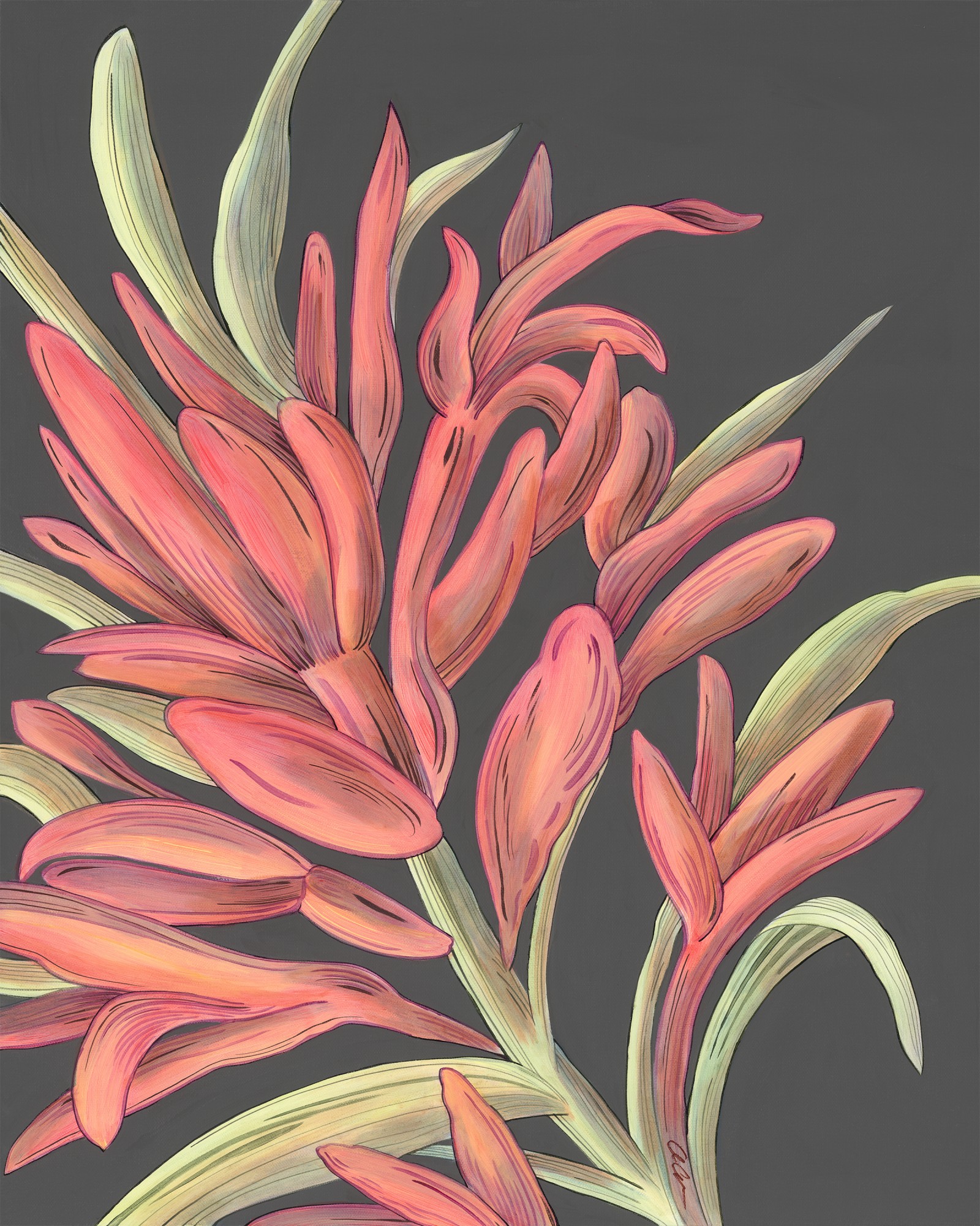 A gorgeous fiery red Indian paintbrush is enlarged and zoomed in for a dynamic composition.This painting by Allison Cosmos lets us appreciate the form and shape of the Indian paintbrush bloom. Popping off the rich graphite charcoal gray background, the red flower makes an eye catching statement. Indian paintbrush is also known as “prairie fire” or castilleja.