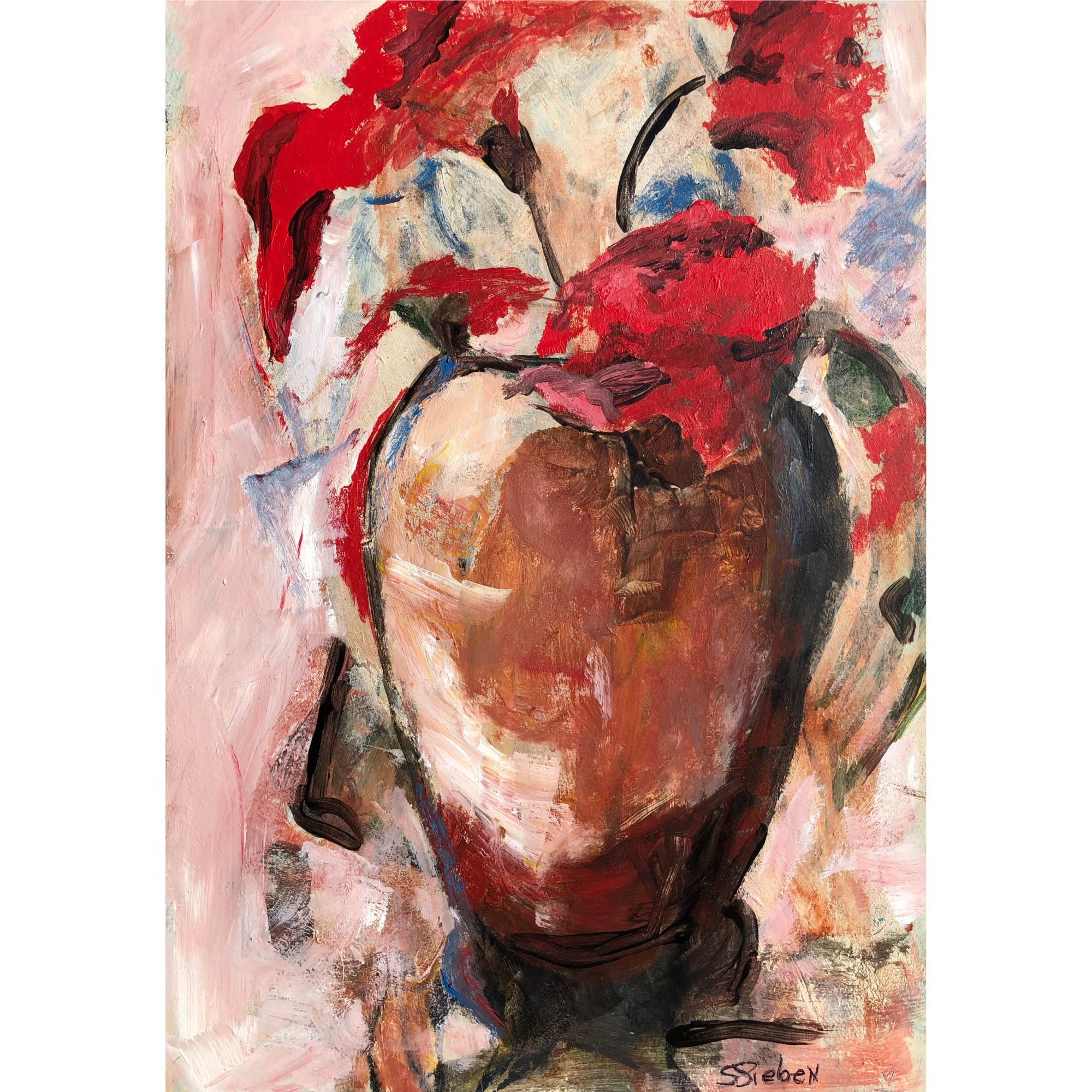 Contemporary floral painting on a 14.5" x 21.5" x .75" deep wood cradle with edges painted black. The artist confesses she almost always chooses red when creating flowers. This piece is wired on the back and arrives "ready to hang"