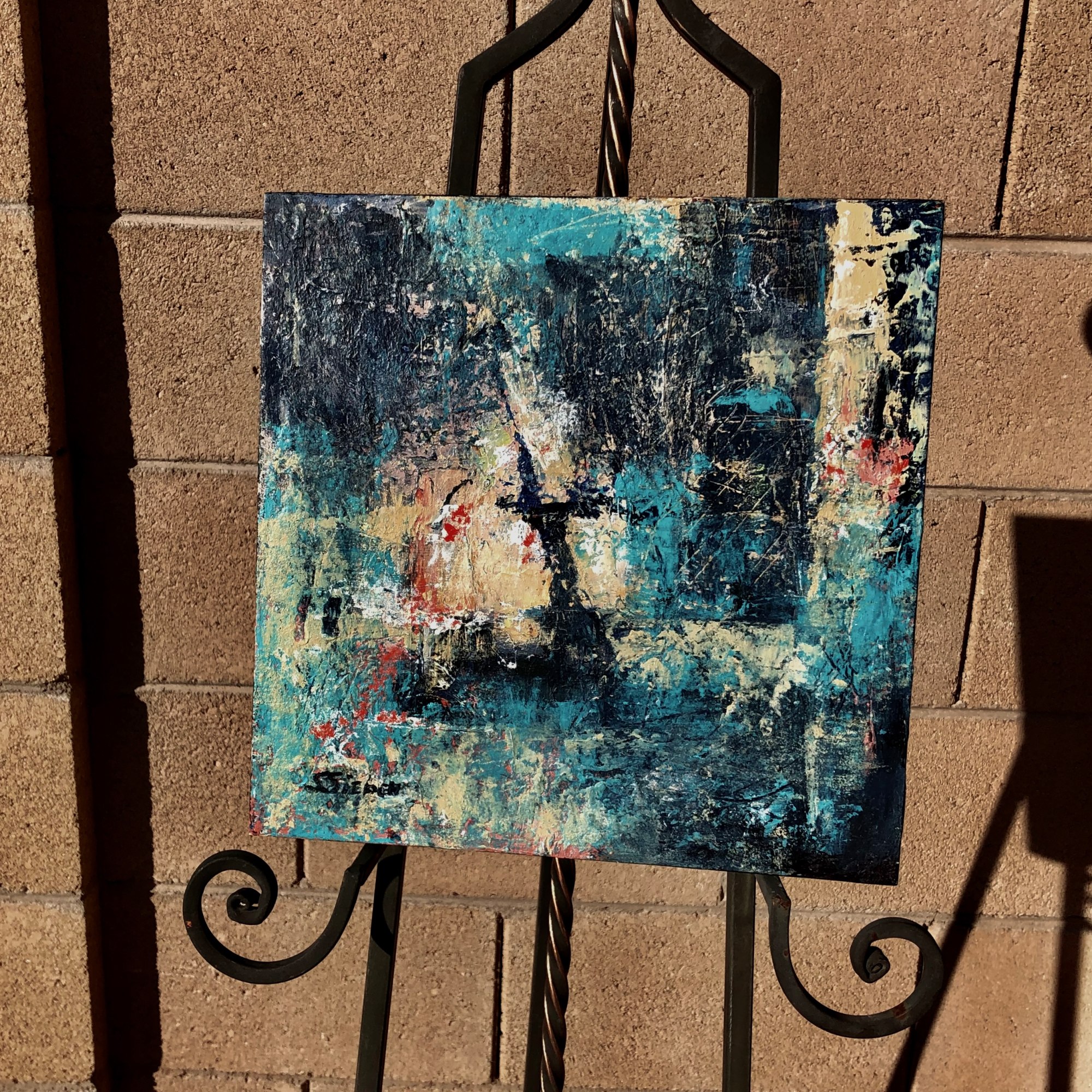 Shapes and deep color almost consume the space around the small darkhapes images struggling to break free. Artwork is wired on the back and arrives "ready to hang"