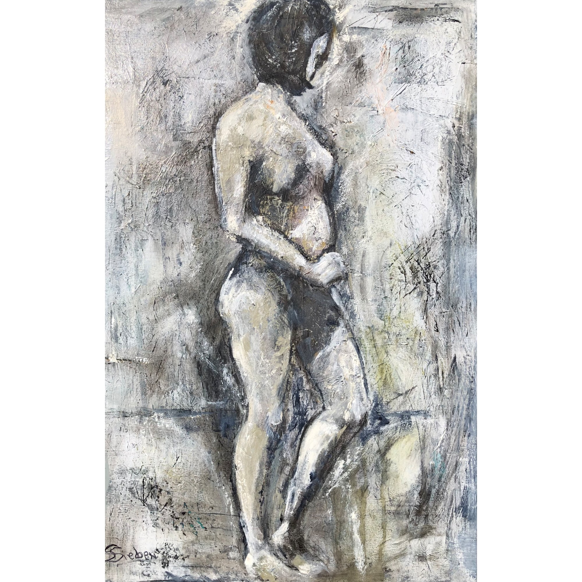 Something said or done does not meet with her approval. The artist, Sharon Sieben uses Layers of graphite and acrylic pigment to create this emotional pose on gallery wrap canvas with edges painted. Wired on the back and "Ready to Hang"