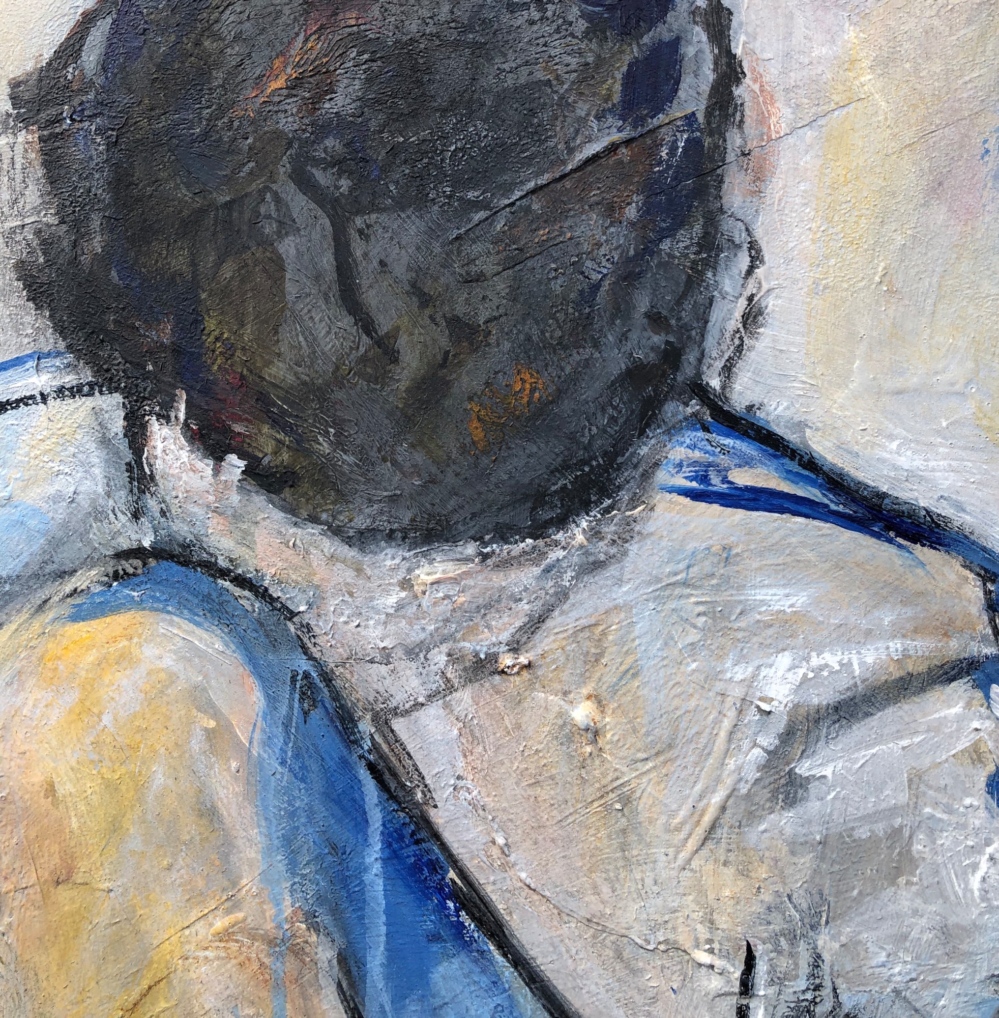 The artist, Sharon Sieben, captures that first moment when the blanket is pushed away and the subject takes time to consider what the day has to offer. This 24" x 30" x 1.5" meditative figurative painting is on a wood cradle with edges painted. Does not need to be framed and arrives wired on the back and "ready to hang: