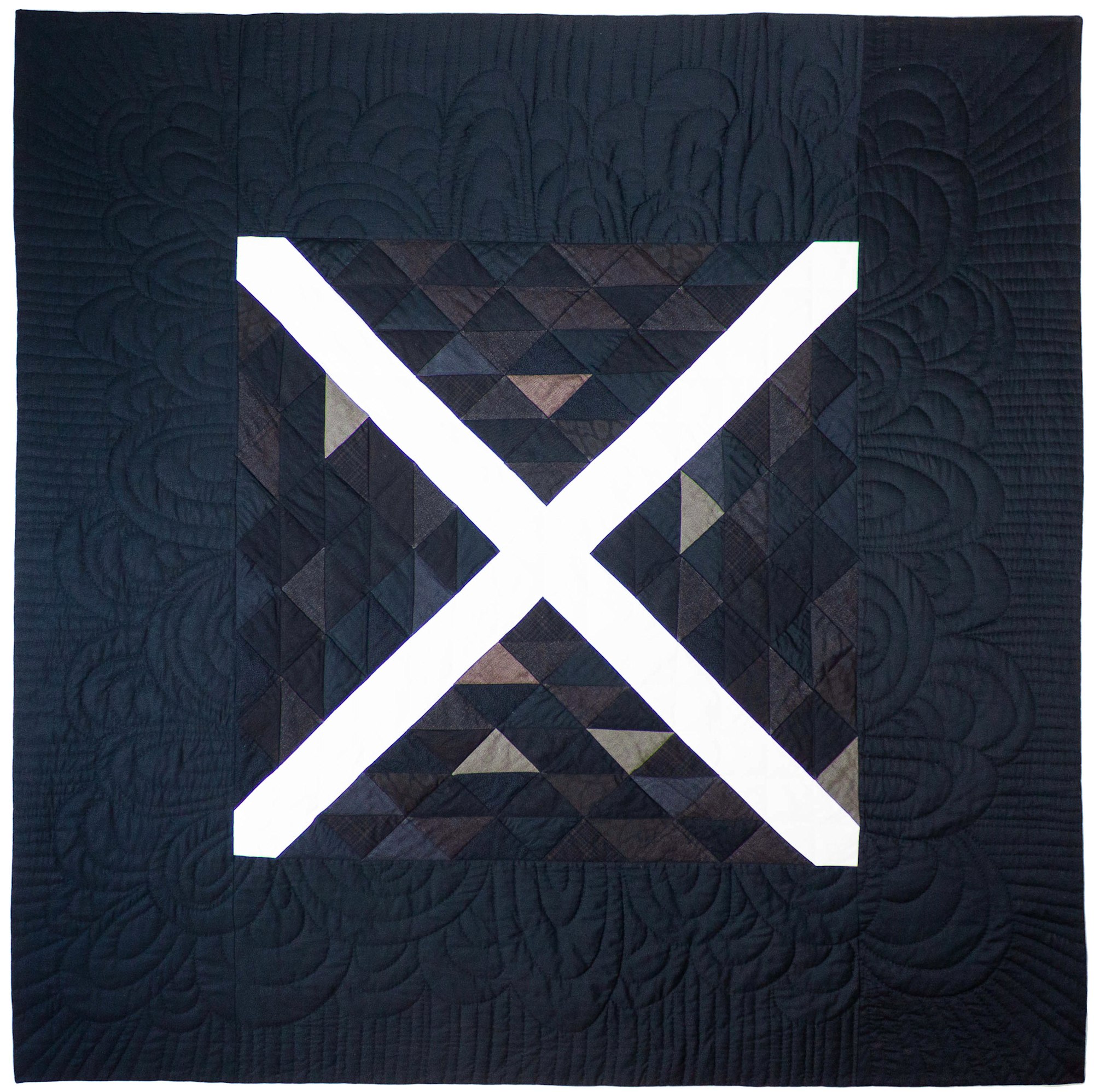 I'm inspired by the bold simplicity of Amish quilts. In my version of a traditional Railroad Crossing quilt, I used scraps of fabric found at a local re-use store as well as remnant linen and bed sheets. I hand quilted muc of the quilt with thick threads and large stitches to emphasize the work.